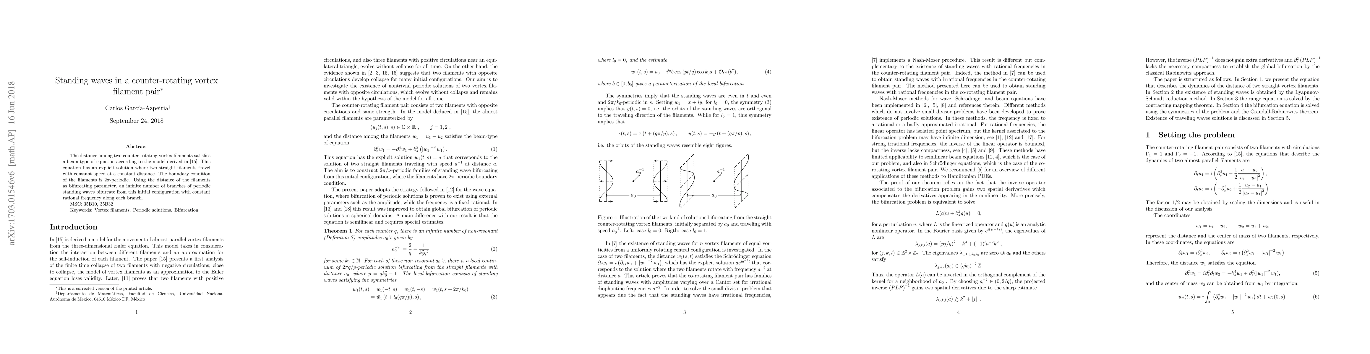 This paper explores the behavior of two counter-rotating vortex filaments modeled by a beam-type equation, revealing an explicit solution where the filaments maintain a constant distance and speed. It identifies an infinite set of periodic standing wave solutions bifurcating from the initial configuration as the distance between filaments varies.