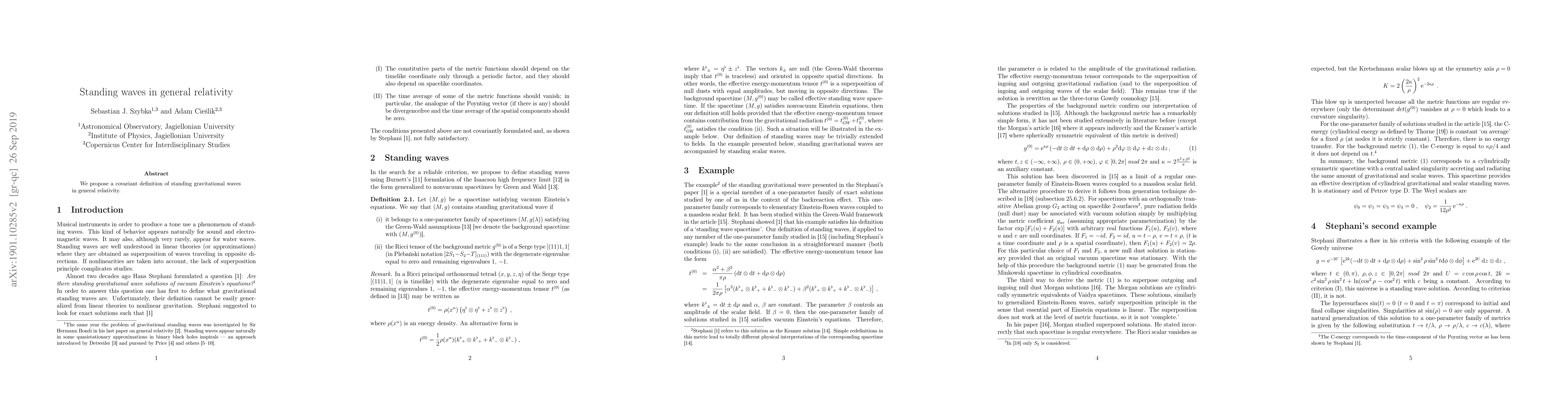Summary: This paper introduces a covariant framework for defining standing gravitational waves within the context of general relativity, providing a novel approach to understanding these phenomena.