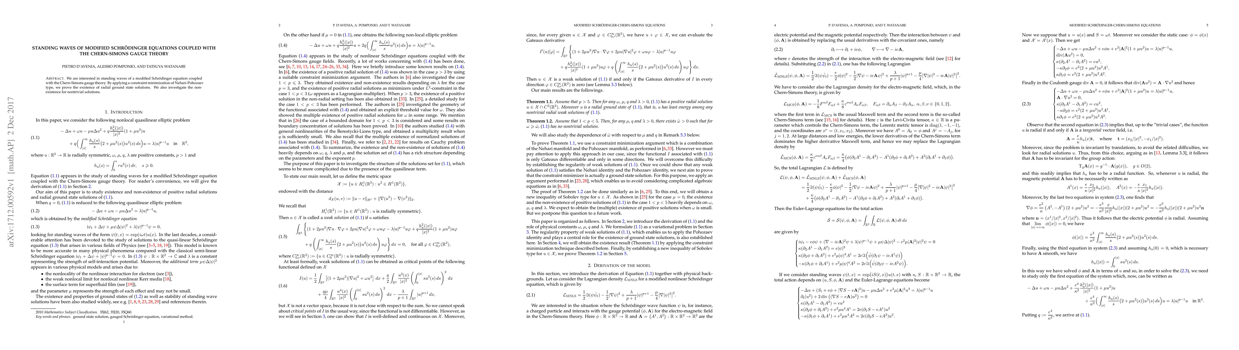 Two-line summary: This research explores standing waves in a modified Schrödinger equation coupled with Chern-Simons gauge theory, proving the existence of radial ground state solutions via Nehari-Pohozaev type constraint minimization. It also examines the non-existence of nontrivial solutions.