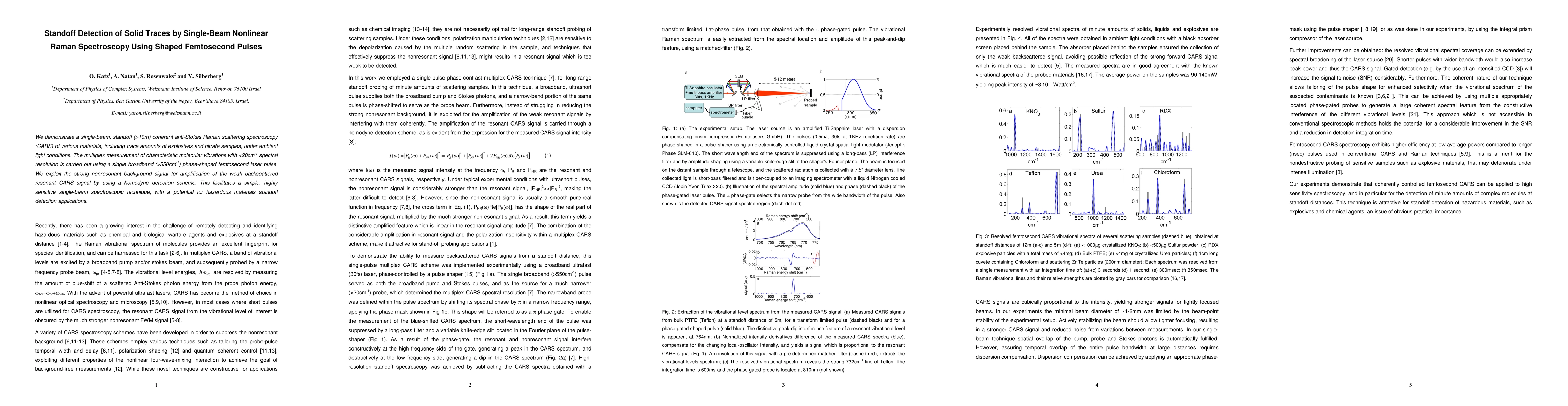 This paper presents a novel single-beam technique for standoff detection of solid traces using shaped femtosecond pulses in coherent anti-Stokes Raman scattering (CARS). The method achieves high sensitivity and spectral resolution, enabling the detection of trace amounts of explosives and nitrates from over 10 meters away.
