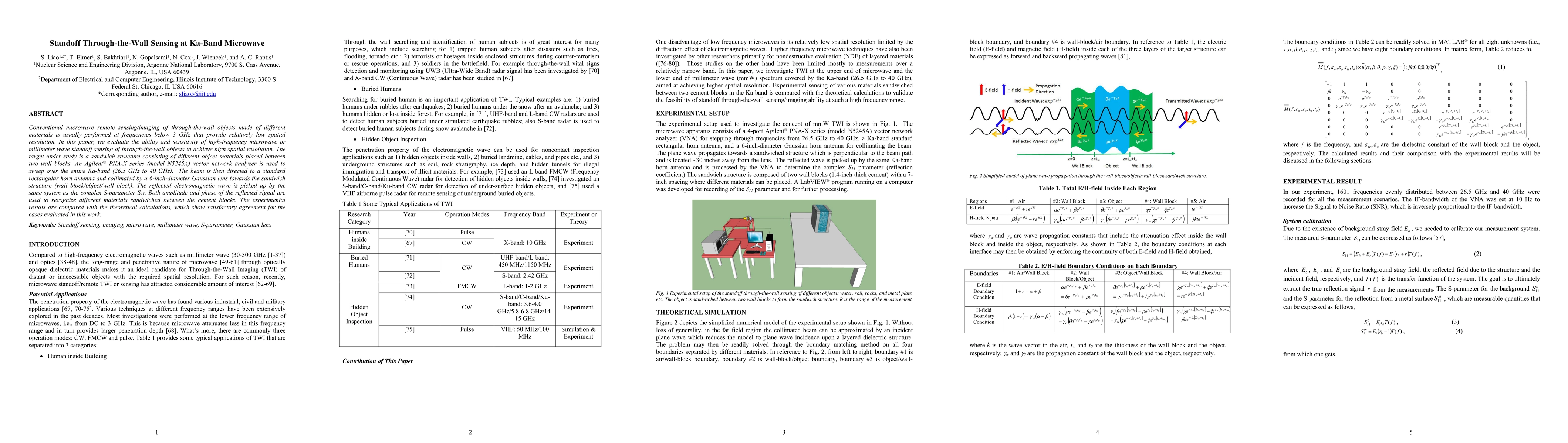 Conventional microwave remote sensing/imaging of through-the-wall objects made of different materials is usually performed at frequencies below 3 GHz that provide relatively low spatial resolution. In this paper, we evaluate the ability and sensitivity of high-frequency microwave or millimeter wave standoff sensing of through-the-wall objects to achieve high spatial resolution. The target under study is a sandwich structure consisting of different object materials placed between two wall blocks. An Agilent PNA-X series (model N5245A) vector network analyzer is used to sweep over the entire Ka-band (26.5 GHz to 40 GHz). The beam is then directed to a standard rectangular horn antenna and collimated by a 6-inch-diameter Gaussian lens towards the sandwich structure (wall block/object/wall block). The reflected electromagnetic wave is picked up by the same system as the complex S-parameter S11. Both amplitude and phase of the reflected signal are used to recognize different materials sandwiched between the cement blocks. The experimental results are compared with the theoretical calculations, which show satisfactory agreement for the cases evaluated in this work.