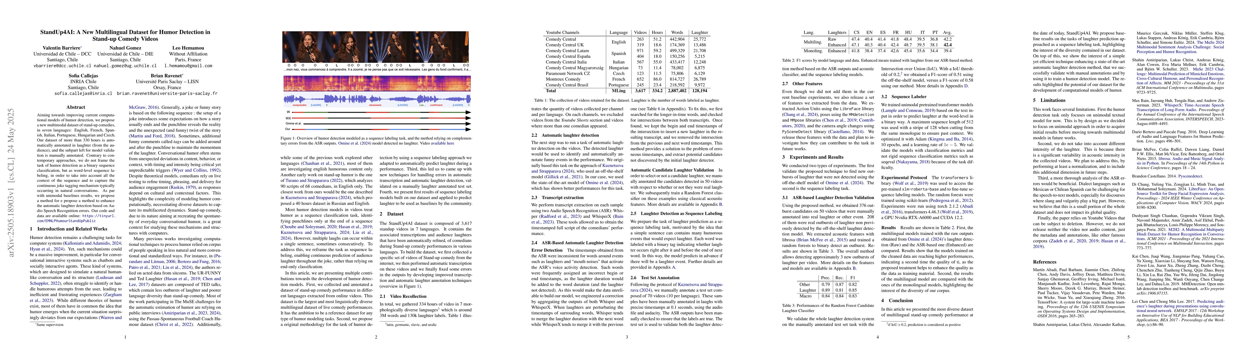 The development of StandUp4AI, a large-scale multilingual dataset with automatic and manual annotations for humor detection in stand-up comedy videos, along with a method to enhance automatic laughter detection based on Audio Speech Recognition errors.