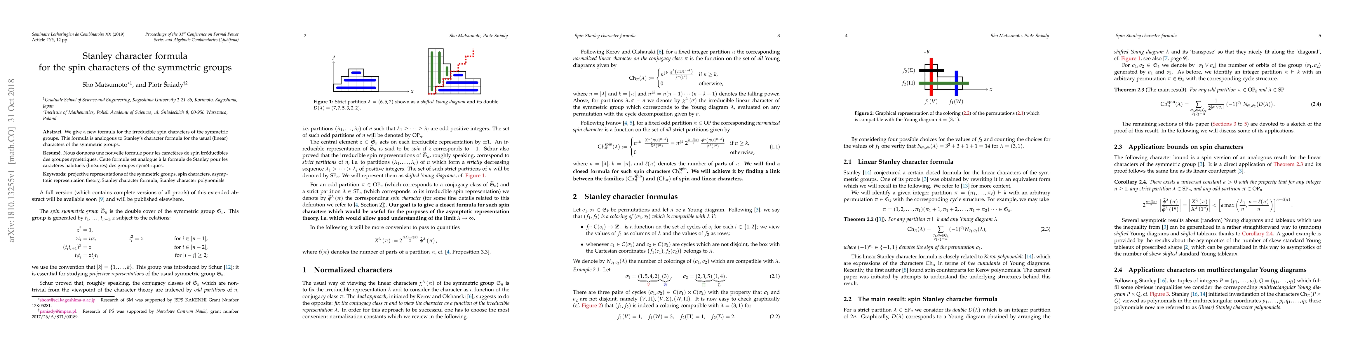 Title: Stanley character formula for the spin characters of the symmetric groups Summary: This paper introduces a new formula analogous to Stanley's character formula for the usual characters, specifically for the irreducible spin characters of symmetric groups.