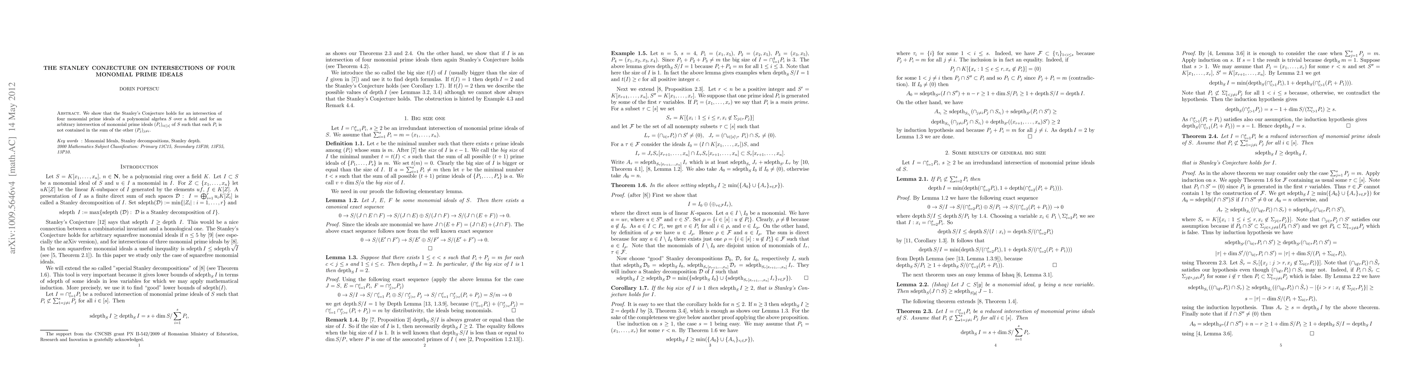Two-line summary: This paper verifies Stanley's Conjecture for the intersection of four monomial prime ideals in a polynomial algebra over a field. It also confirms the conjecture for any intersection of monomial prime ideals where no single ideal is contained within the union of the others.
