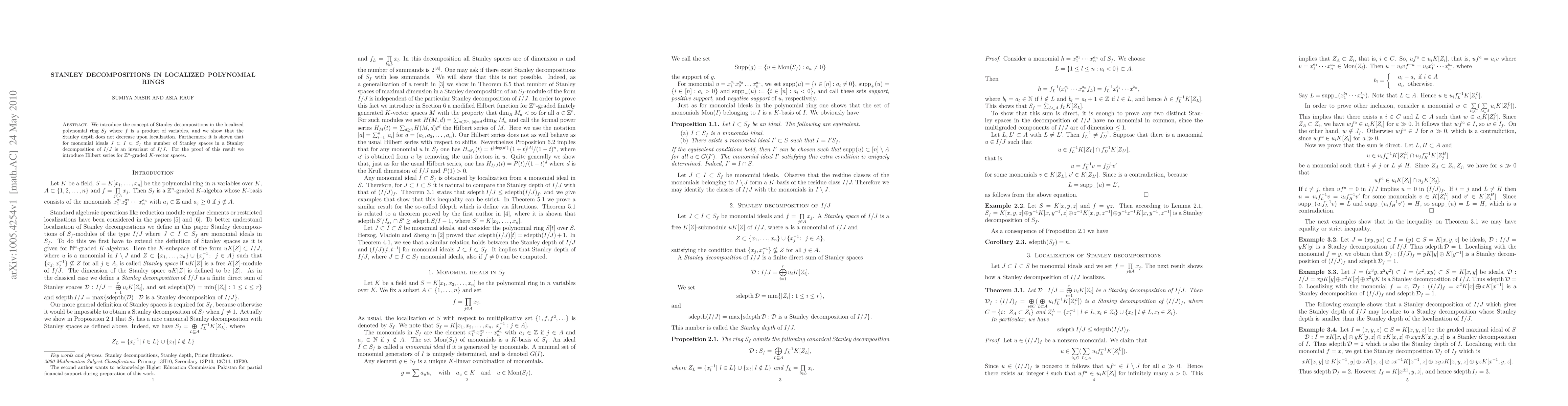 This paper introduces Stanley decompositions in localized polynomial rings $S_f$ and demonstrates that Stanley depth remains unchanged upon localization. It also establishes that the number of Stanley spaces in a Stanley decomposition of $I/J$ for monomial ideals is invariant, utilizing Hilbert series for $\ZZ^n$-graded $K$-vector spaces in the proof.