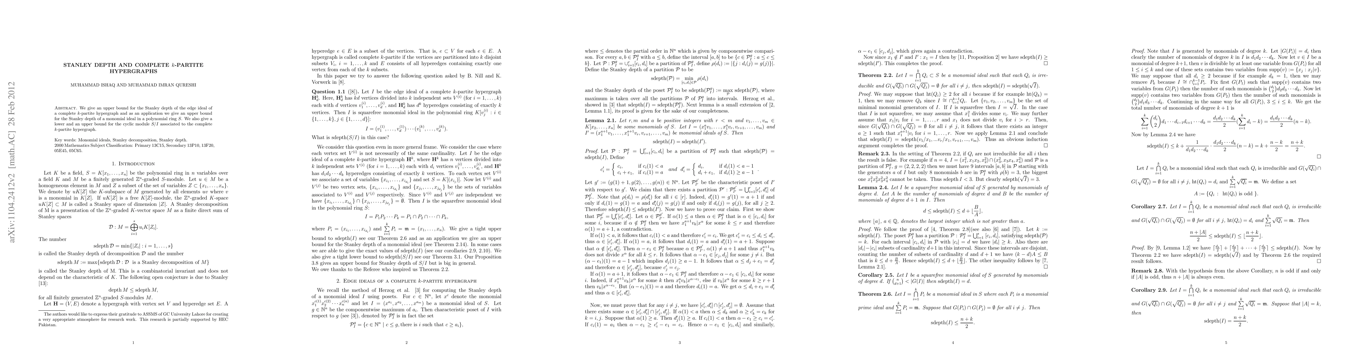 This paper provides an upper bound for the Stanley depth of the edge ideal of a complete $k$-partite hypergraph and applies this to derive an upper bound for the Stanley depth of a monomial ideal in a polynomial ring $S$. It also establishes bounds for the cyclic module $S/I$ associated with the hypergraph.