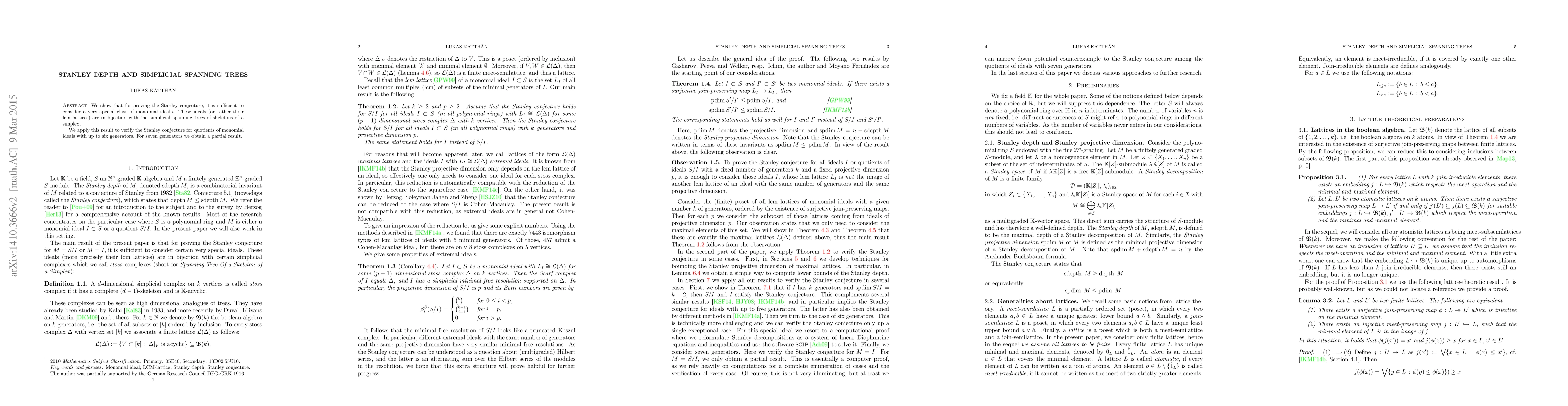 We show that for proving the Stanley conjecture, it is sufficient to consider a very special class of monomial ideals. These ideals (or rather their lcm lattices) are in bijection with the simplicial spanning trees of skeletons of a simplex. We apply this result to verify the Stanley conjecture for quotients of monomial ideals with up to six generators. For seven generators we obtain a partial result.