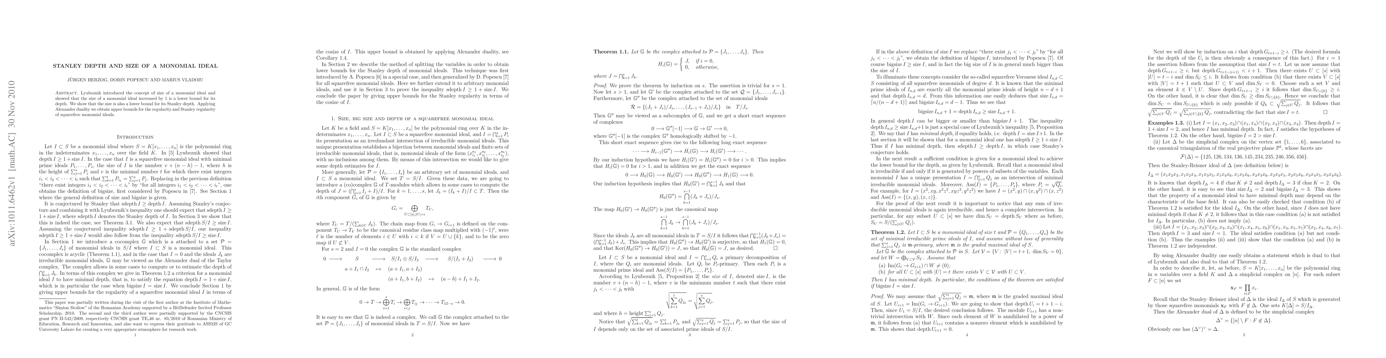 The research builds upon Lyubeznik's concept of size for monomial ideals, applying Alexander duality to derive bounds for regularity and Stanley regularity of squarefree monomial ideals.