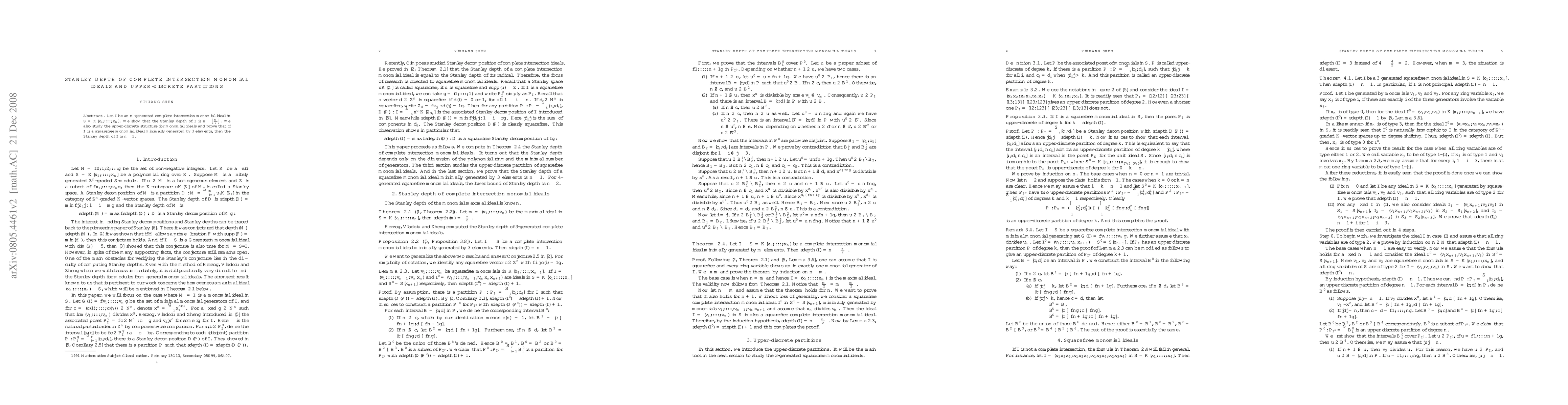 This paper establishes that the Stanley depth of a complete intersection monomial ideal $I$ in a polynomial ring $S$ is $n - \floor{\frac{m}{2}}$, where $m$ is the number of generators. It further explores the upper-discrete structure for squarefree monomial ideals, proving that if $I$ is minimally generated by 3 elements, its Stanley depth is $n-1$.