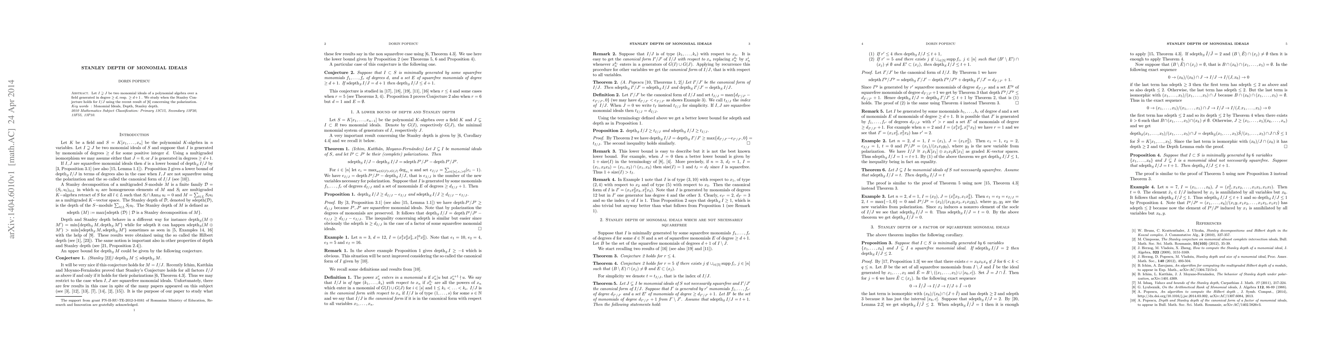 Let $I\supsetneq J$ be two monomial ideals of a polynomial algebra over a field generated in degree $\geq d$, resp. $\geq d+1$ . We study when the Stanley Conjecture holds for $I/J$ using the recent result of \cite{IKM} concerning the polarization.