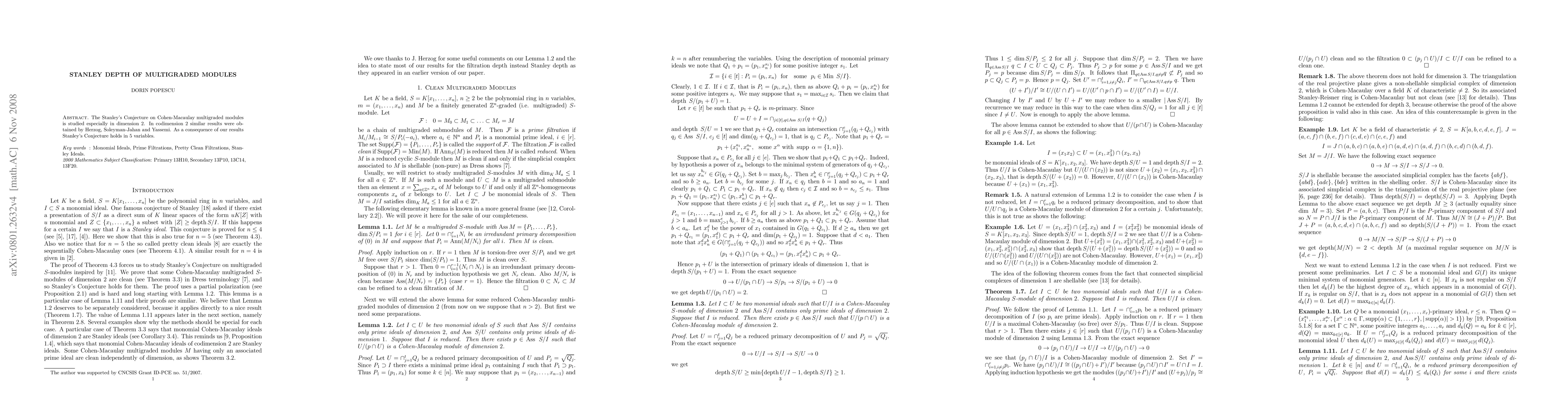 This paper investigates Stanley's Conjecture concerning Cohen-Macaulay multigraded modules, particularly in dimension 2, confirming similar results obtained previously in codimension 2. Consequently, the conjecture is validated for modules in 5 variables.