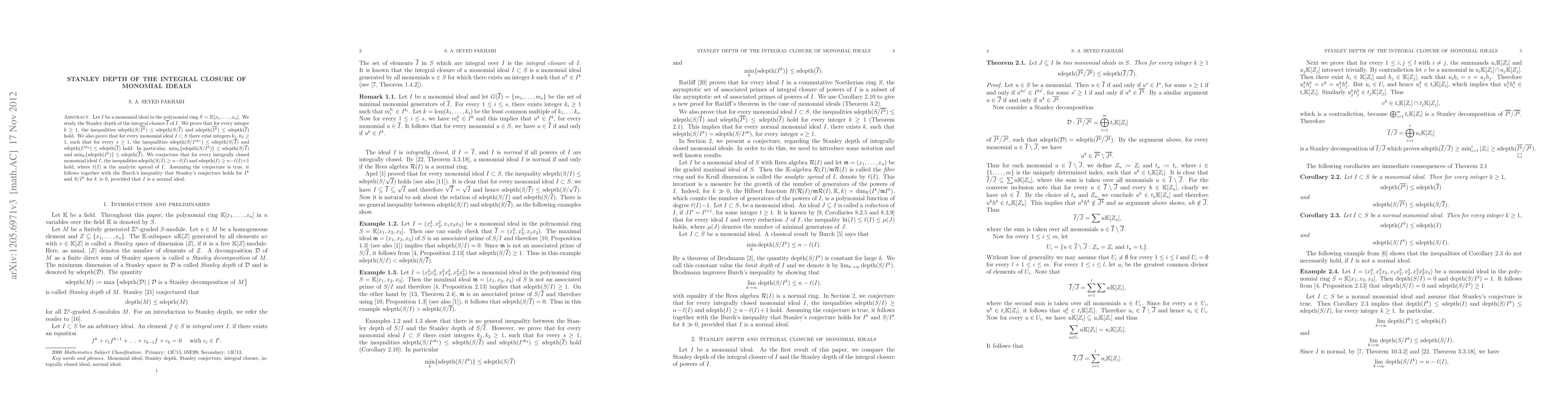 Let $I$ be a monomial ideal in the polynomial ring $S=\mathbb{K}[x_1,...,x_n]$. We study the Stanley depth of the integral closure $\bar{I}$ of $I$. We prove that for every integer $k\geq 1$, the inequalities ${\rm sdepth} (S/\bar{I^k}) \leq {\rm sdepth} (S/\bar{I})$ and ${\rm sdepth} (\bar{I^k}) \leq {\rm sdepth} (\bar{I})$ hold. We also prove that for every monomial ideal $I\subset S$ there exist integers $k_1,k_2\geq 1$, such that for every $s\geq 1$, the inequalities ${\rm sdepth} (S/I^{sk_1}) \leq {\rm sdepth} (S/\bar{I})$ and ${\rm sdepth} (I^{sk_2}) \leq {\rm sdepth} (\bar{I})$ hold. In particular, $\min_k \{{\rm sdepth} (S/I^k)\} \leq {\rm sdepth} (S/\bar{I})$ and $\min_k \{{\rm sdepth} (I^k)\} \leq {\rm sdepth} (\bar{I})$. We conjecture that for every integrally closed monomial ideal $I$, the inequalities ${\rm sdepth}(S/I)\geq n-\ell(I)$ and ${\rm sdepth} (I)\geq n-\ell(I)+1$ hold, where $\ell(I)$ is the analytic spread of $I$. Assuming the conjecture is true, it follows together with the Burch's inequality that Stanley's conjecture holds for $I^k$ and $S/I^k$ for $k\gg 0$, provided that $I$ is a normal ideal.
