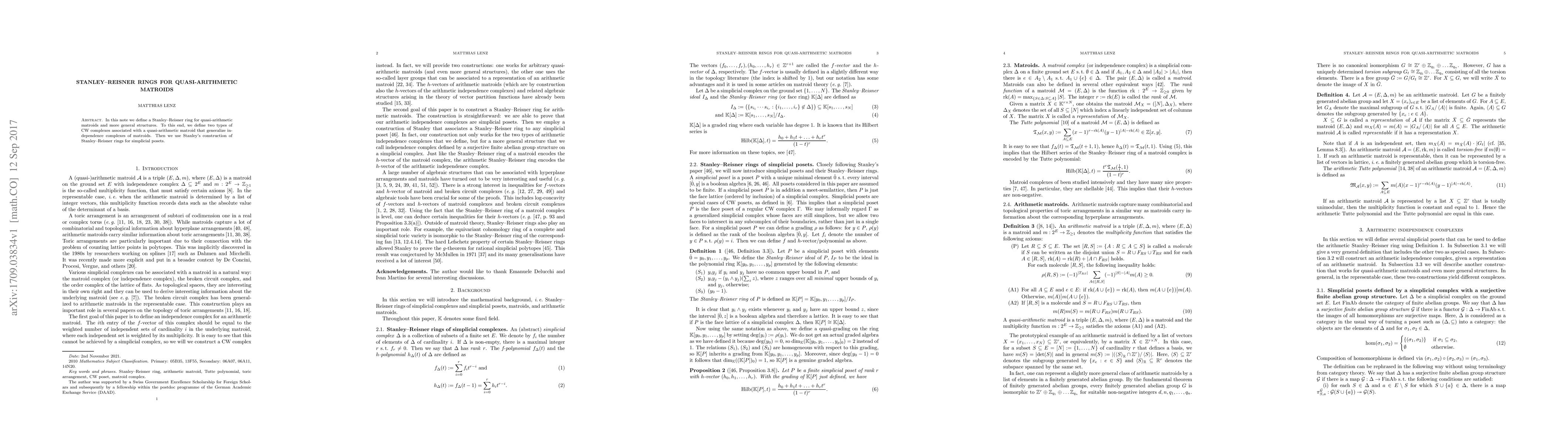 In this note we define a Stanley-Reisner ring for quasi-arithmetic matroids and more general structures. To this end, we define two types of CW complexes associated with a quasi-arithmetic matroid that generalize independence complexes of matroids. Then we use Stanley's construction of Stanley-Reisner rings for simplicial posets.