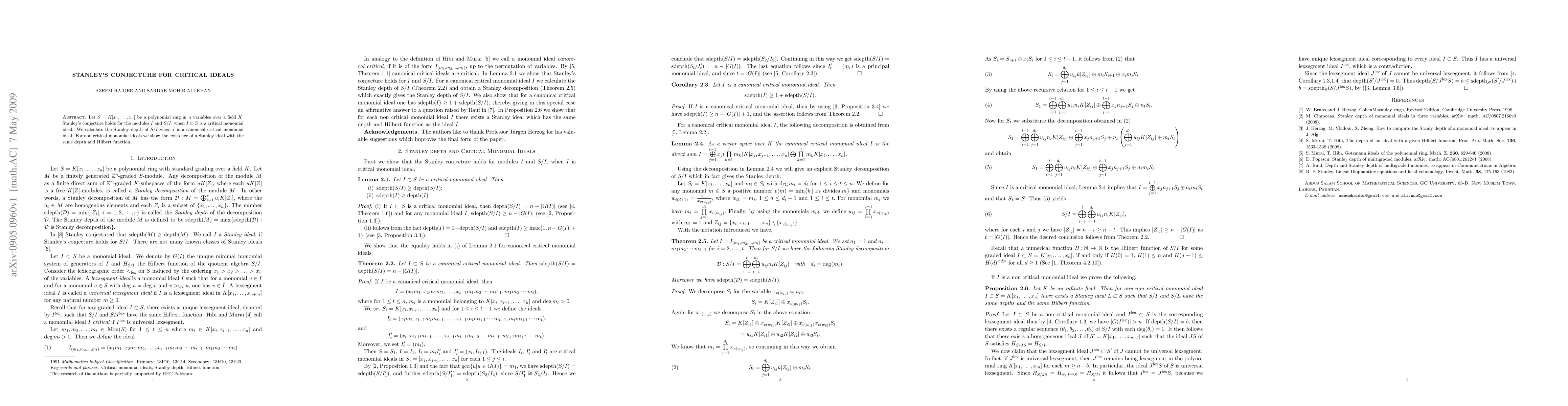 Stanley's conjecture is verified for modules associated with critical monomial ideals in polynomial rings, and the Stanley depth of such ideals is calculated. For non-critical monomial ideals, a Stanley ideal with matching depth and Hilbert function is identified.