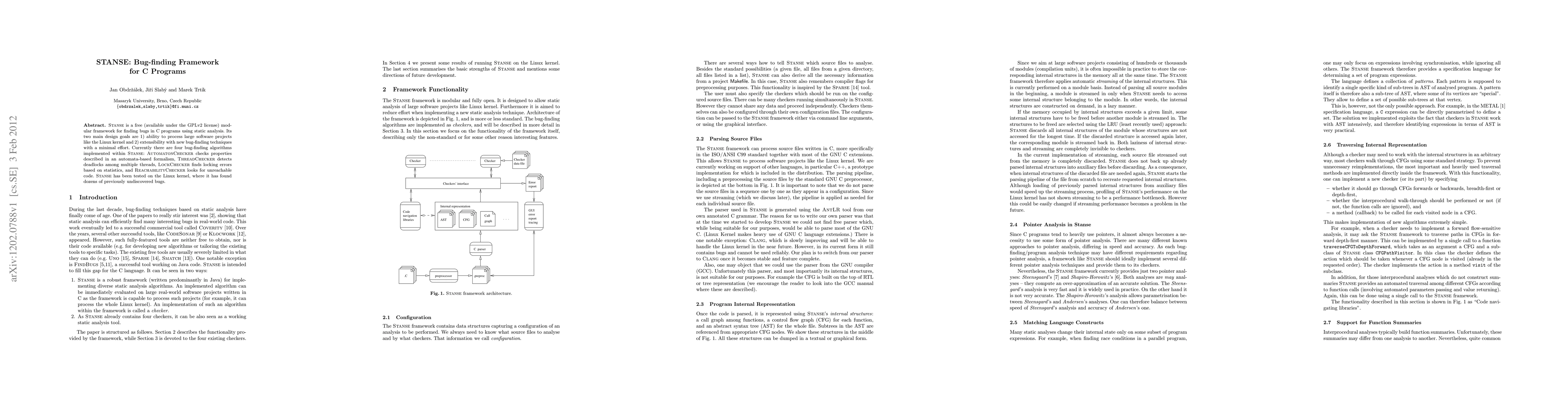 STANSE is a modular static analysis framework for finding bugs in C programs, designed to handle large projects like the Linux kernel and easily extend with new detection techniques. It includes four algorithms for detecting various types of bugs, and has successfully uncovered numerous undiscovered issues in the Linux kernel.