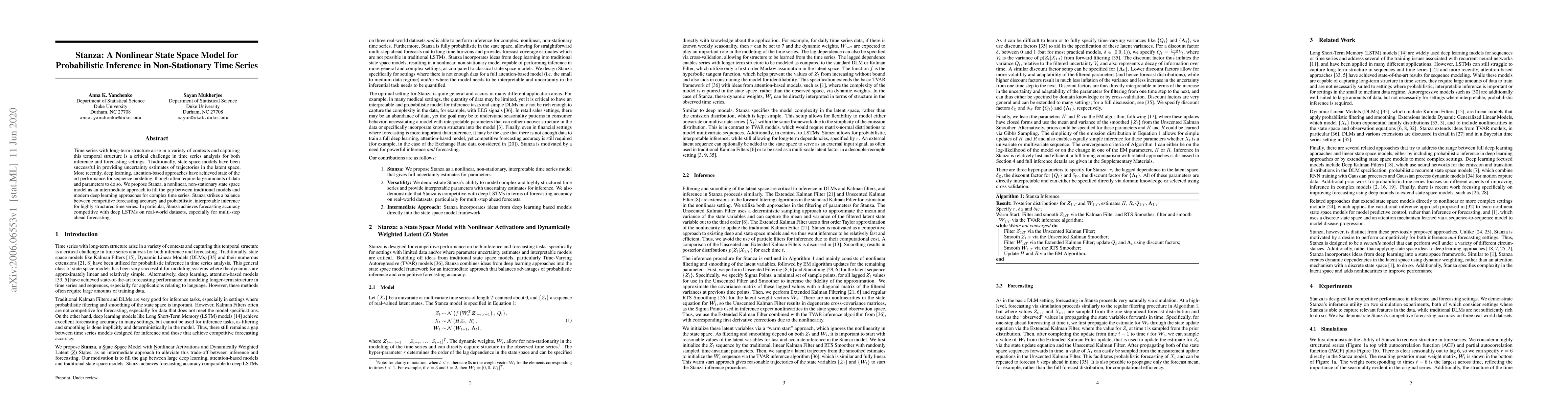 Stanza introduces a nonlinear, non-stationary state space model for probabilistic inference in complex, structured time series, balancing competitive forecasting accuracy with interpretable inference. It achieves results comparable to deep LSTMs, particularly for multi-step ahead forecasting.