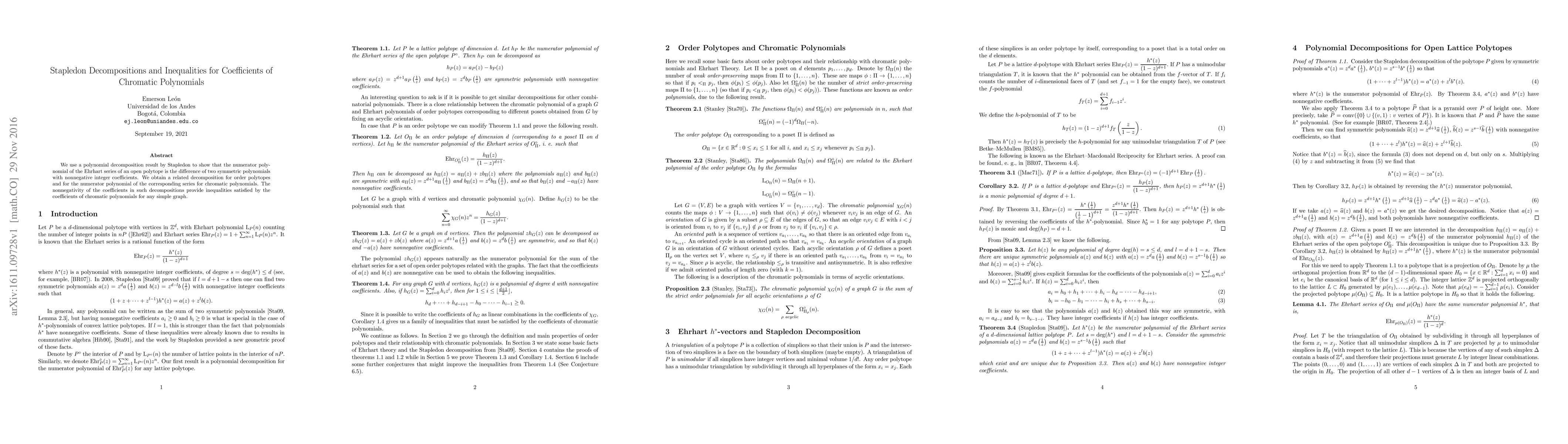 Summary: Stapledon's polynomial decomposition method is applied to demonstrate that the numerator of the Ehrhart series for open polytopes is a difference of two nonnegative symmetric polynomials. Similar decompositions are derived for order polytopes and chromatic polynomials, yielding inequalities for the coefficients of chromatic polynomials of any simple graph.