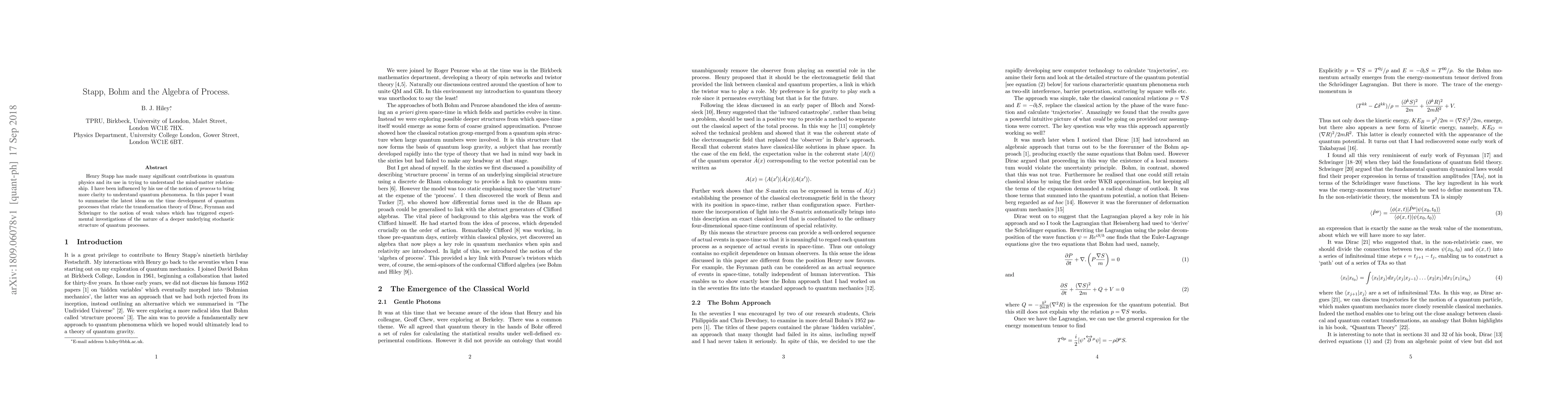 Henry Stapp has made many significant contributions in quantum physics and its use in trying to understand the mind-matter relationship. I have been influenced by his use of the notion of {\em process} to bring more clarity to understand quantum phenomena. In this paper I want to summarise the latest ideas on the time development of quantum processes that relate the transformation theory of Dirac, Feynman and Schwinger to the notion of weak values which has triggered experimental investigations of the nature of a deeper underlying stochastic structure of quantum processes.