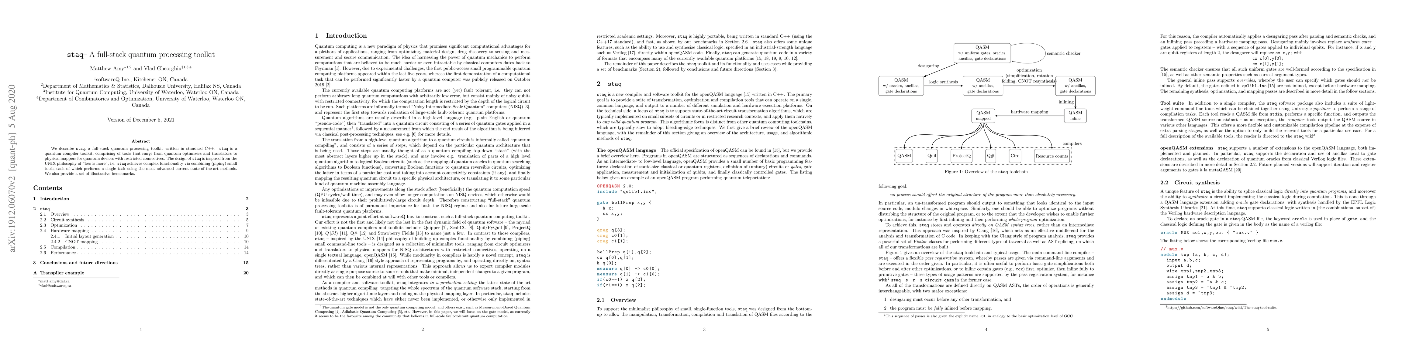 We describe 'staq', a full-stack quantum processing toolkit written in standard C++. 'staq' is a quantum compiler toolkit, comprising of tools that range from quantum optimizers and translators to physical mappers for quantum devices with restricted connectives. The design of 'staq' is inspired from the UNIX philosophy of "less is more", i.e. 'staq' achieves complex functionality via combining (piping) small tools, each of which performs a single task using the most advanced current state-of-the-art methods. We also provide a set of illustrative benchmarks.