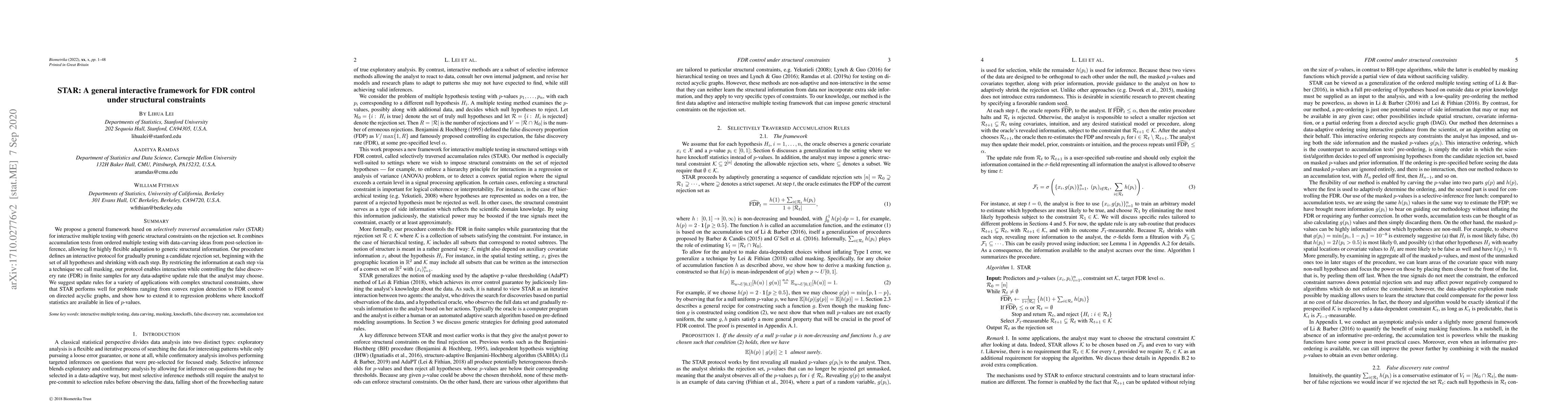 This paper introduces STAR, a framework for interactive multiple testing that controls the false discovery rate (FDR) under structural constraints. It combines accumulation tests and data-carving techniques to adaptively prune a candidate rejection set, ensuring FDR control through a masking technique.
