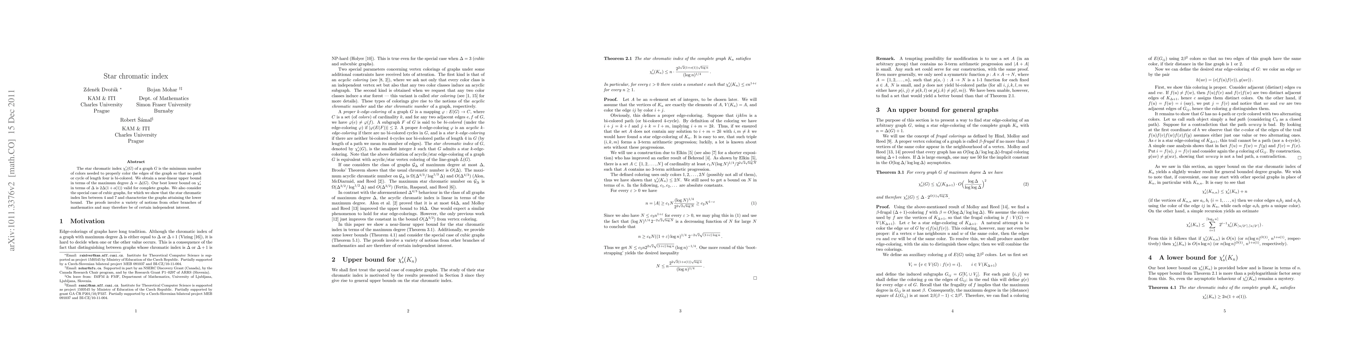 The star chromatic index η_s'(G) of a graph G is the minimum number of colors needed to color edges so that no path or cycle of length four is bi-colored. The paper establishes a near-linear upper bound in terms of maximum degree δ and shows that the star chromatic index for cubic graphs lies between 4 and 7.