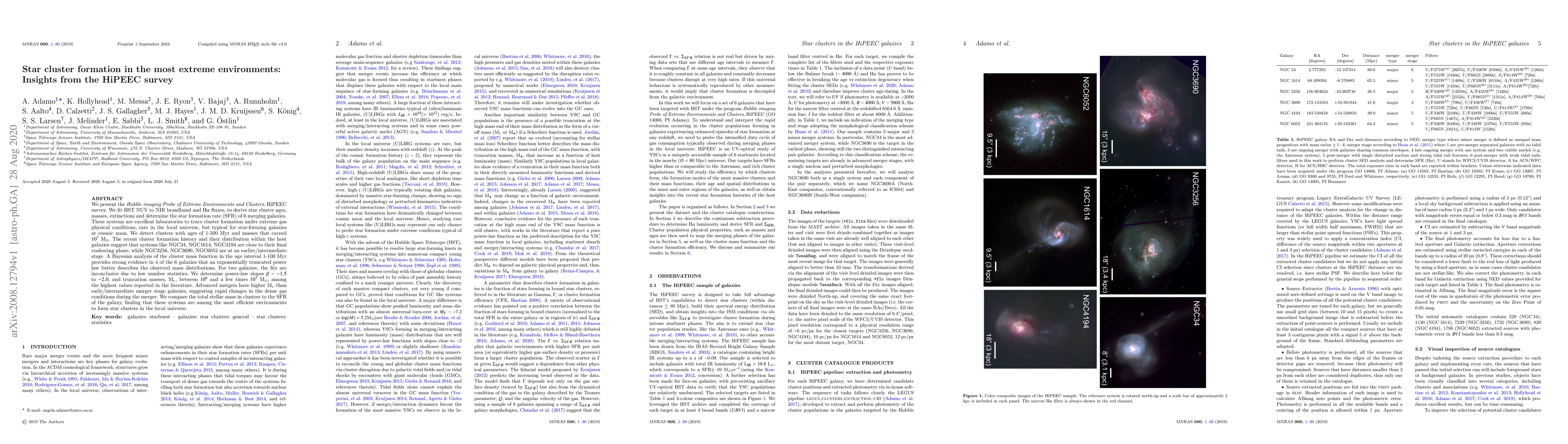 We present the Hubble imaging Probe of Extreme Environments and Clusters (HiPEEC) survey. We fit HST NUV to NIR broadband and H$\alpha$ fluxes, to derive star cluster ages, masses, extinctions and determine the star formation rate (SFR) of 6 merging galaxies. These systems are excellent laboratories to trace cluster formation under extreme gas physical conditions, rare in the local universe, but typical for star-forming galaxies at cosmic noon. We detect clusters with ages of 1-500 Myr and masses that exceed $10^7$ M$_\odot$. The recent cluster formation history and their distribution within the host galaxies suggest that systems like NGC34, NGC1614, NGC4194 are close to their final coalescing phase, while NGC3256, NGC3690, NGC6052 are at an earlier/intermediate stage. A Bayesian analysis of the cluster mass function in the age interval 1-100 Myr provides strong evidence in 4 of the 6 galaxies that an exponentially truncated power law better describes the observed mass distributions. For two galaxies, the fits are inconclusive due to low number statistics. We determine power-law slopes $\beta \sim-1.5$ to $-2.0$, and truncation masses, M$_c$, between $10^6$ and a few times $10^7$ M$_\odot$, among the highest values reported in the literature. Advanced mergers have higher M$_c$ than early/intermediate merger stage galaxies, suggesting rapid changes in the dense gas conditions during the merger. We compare the total stellar mass in clusters to the SFR of the galaxy, finding that these systems are among the most efficient environments to form star clusters in the local universe.