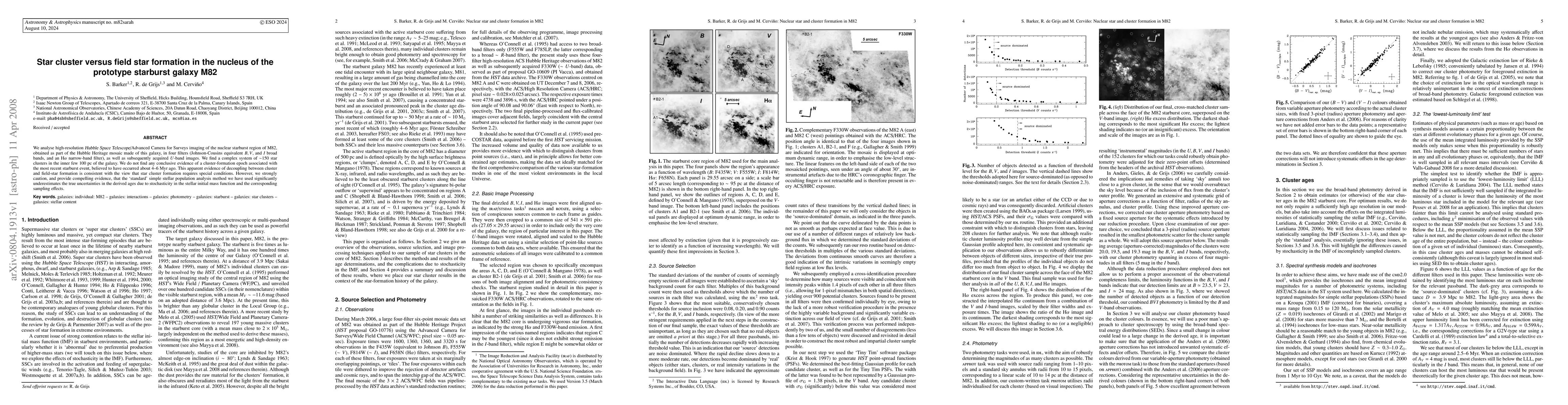 We analyse high-resolution Hubble Space Telescope/Advanced Camera for Surveys imaging of the nuclear starburst region of M82, obtained as part of the Hubble Heritage mosaic made of this galaxy, in four filters (Johnson-Cousins equivalent B, V, and I broad bands, and an Halpha narrow-band filter), as well as subsequently acquired U-band images. We find a complex system of ~150 star clusters in the inner few 100 pc of the galaxy. We do not find any conclusive evidence of a cluster-formation epoch associated with the most recent starburst event, believed to have occurred about 4-6 Myr ago. This apparent evidence of decoupling between cluster and field-star formation is consistent with the view that star cluster formation requires special conditions. However, we strongly caution, and provide compelling evidence, that the `standard' simple stellar population analysis method we have used significantly underestimates the true uncertainties in the derived ages due to stochasticity in the stellar initial mass function and the corresponding sampling effects.
