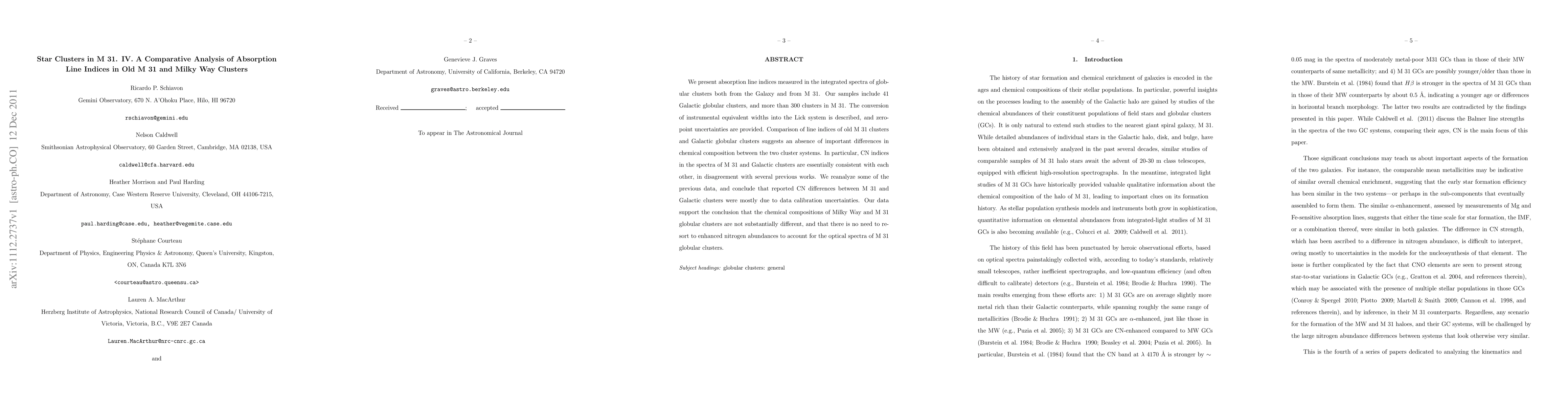 We present absorption line indices measured in the integrated spectra of globular clusters both from the Galaxy and from M 31. Our samples include 41 Galactic globular clusters, and more than 300 clusters in M 31. The conversion of instrumental equivalent widths into the Lick system is described, and zero-point uncertainties are provided. Comparison of line indices of old M 31 clusters and Galactic globular clusters suggests an absence of important differences in chemical composition between the two cluster systems. In particular, CN indices in the spectra of M 31 and Galactic clusters are essentially consistent with each other, in disagreement with several previous works. We reanalyze some of the previous data, and conclude that reported CN differences between M 31 and Galactic clusters were mostly due to data calibration uncertainties. Our data support the conclusion that the chemical compositions of Milky Way and M 31 globular clusters are not substantially different, and that there is no need to resort to enhanced nitrogen abundances to account for the optical spectra of M 31 globular clusters.
