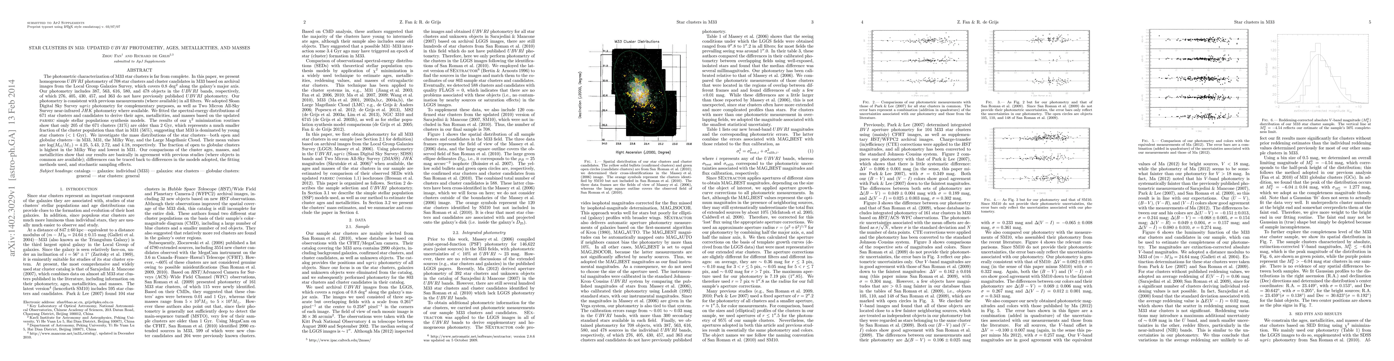 This paper provides homogeneous UBVRI photometry for 708 star clusters in M33, revealing that 70% of them are younger than 1 Gyr, contrasting with older clusters in M31. The study also compares the mass distributions of star clusters across different galaxies, finding M33 dominated by young clusters.