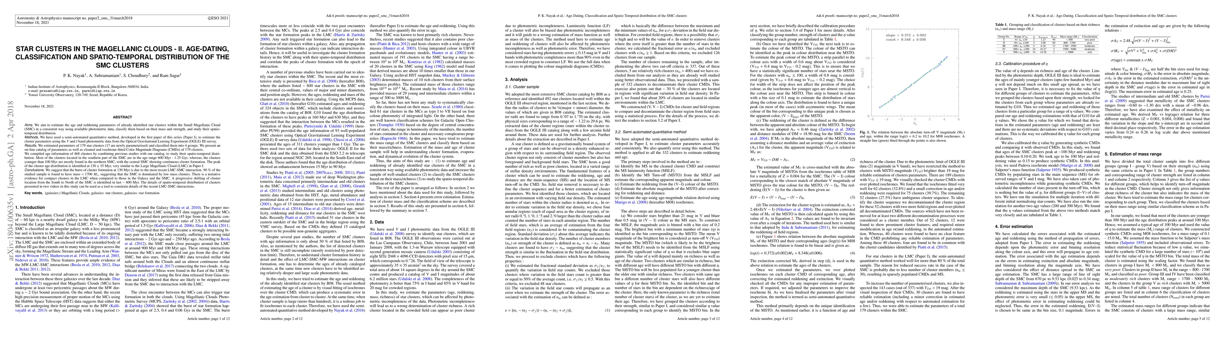 This paper estimates the age and reddening parameters of 179 star clusters in the Small Magellanic Cloud (SMC), classifying them based on mass and strength. The study reveals a peak cluster formation age of 130 Myr, suggesting recent LMC-SMC interaction, and identifies a spatial shift in cluster formation from south to north over the last 600 Myr.