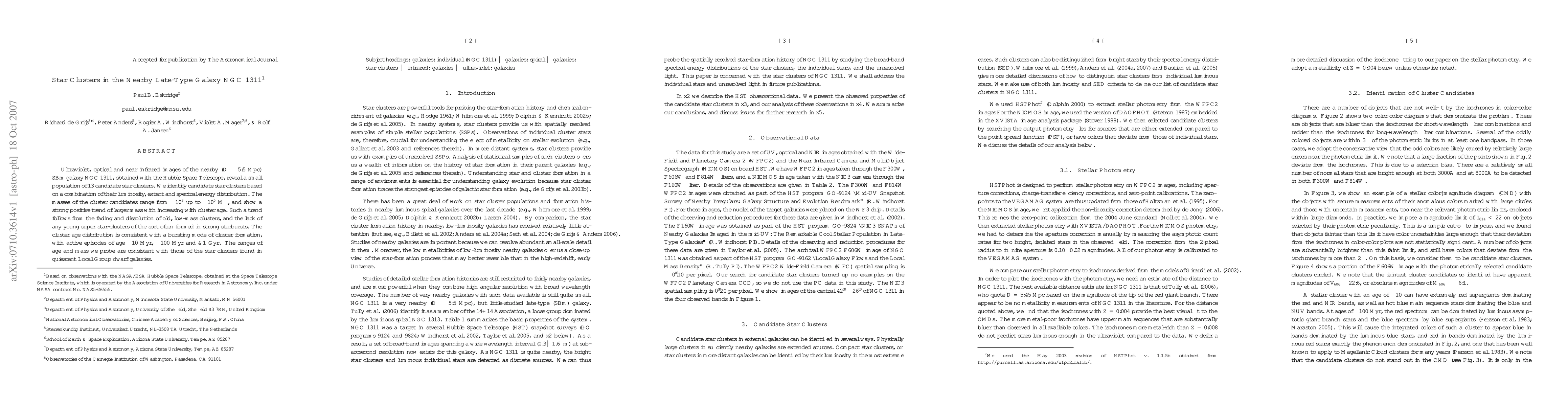 Ultraviolet, optical and near infrared images of the nearby (D ~ 5.5 Mpc) SBm galaxy NGC 1311, obtained with the Hubble Space Telescope, reveal a small population of 13 candidate star clusters. We identify candidate star clusters based on a combination of their luminosity, extent and spectral energy distribution. The masses of the cluster candidates range from ~1000 up to ~100000 Solar masses, and show a strong positive trend of larger mass with increasing with cluster age. Such a trend follows from the fading and dissolution of old, low-mass clusters, and the lack of any young super star clusters of the sort often formed in strong starbursts. The cluster age distribution is consistent with a bursting mode of cluster formation, with active episodes of age ~10 Myr, ~100 Myr and ~1 Gyr. The ranges of age and mass we probe are consistent with those of the star clusters found in quiescent Local Group dwarf galaxies.