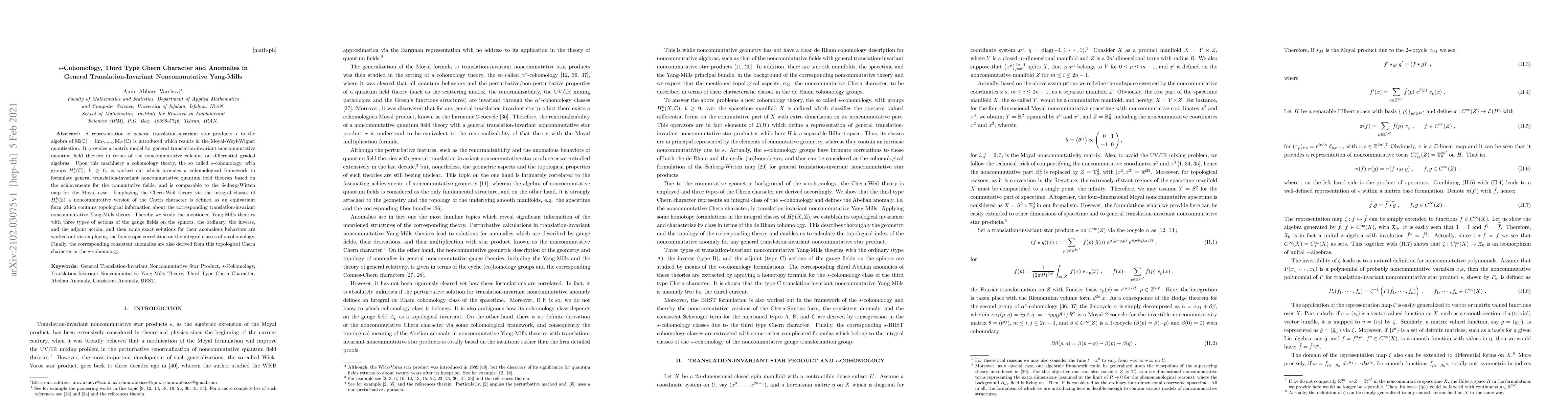 This paper introduces a star-cohomology framework for translation-invariant noncommutative quantum field theories, employing the Moyal-Weyl-Wigner quantization. It develops a noncommutative version of the Chern character to study translation-invariant noncommutative Yang-Mills theories, examining three types of gauge field actions and deriving exact solutions for their anomalies.