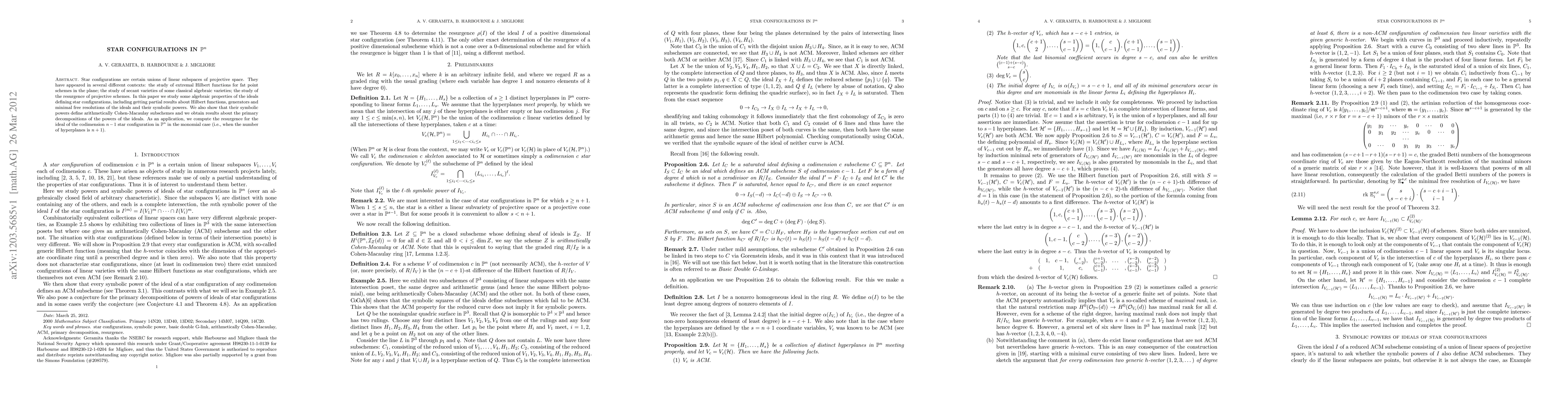 Star configurations are certain unions of linear subspaces of projective space. They have appeared in several different contexts: the study of extremal Hilbert functions for fat point schemes in the plane; the study of secant varieties of some classical algebraic varieties; the study of the resurgence of projective schemes. In this paper we study some algebraic properties of the ideals defining star configurations, including getting partial results about Hilbert functions, generators and minimal free resolutions of the ideals and their symbolic powers. We also show that their symbolic powers define arithmetically Cohen-Macaulay subschemes and we obtain results about the primary decompositions of the powers of the ideals. As an application, we compute the resurgence for the ideal of the codimension $n-1$ star configuration in $\pr{n}$ in the monomial case (i.e., when the number of hyperplanes is $n+1$).