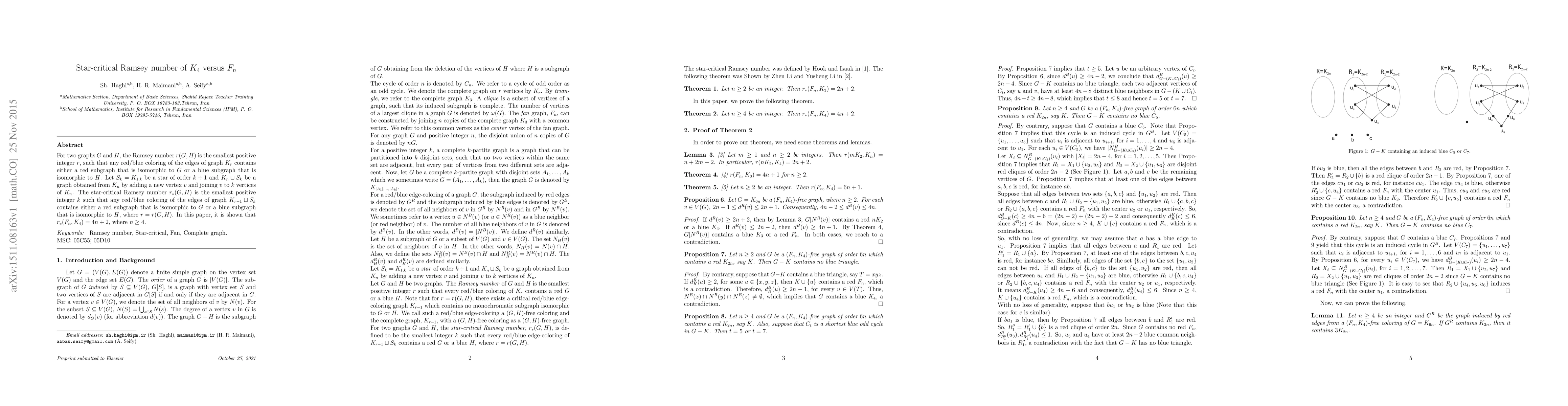 This paper investigates the star-critical Ramsey number $r_*(F_n,K_4)$, demonstrating that it equals $4n+2$ for $n \geq 4$, where $F_n$ is a graph formed by adding a star $S_k$ to a complete graph $K_n$.