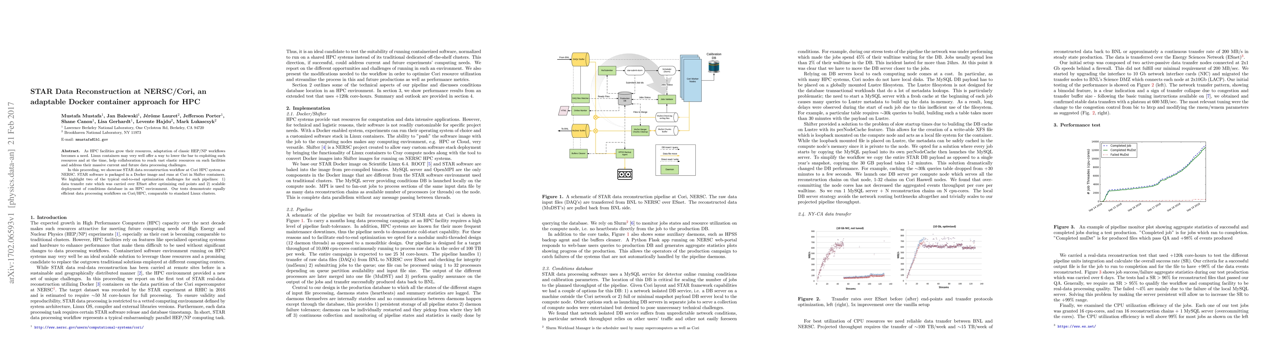 This paper presents a Docker container approach for reconstructing STAR data on the Cori HPC system at NERSC, showcasing optimized data transfer rates and scalable deployment of the conditions database. The study demonstrates efficient data processing comparable to standard Linux clusters, highlighting the potential of Linux containers in addressing HPC data challenges.