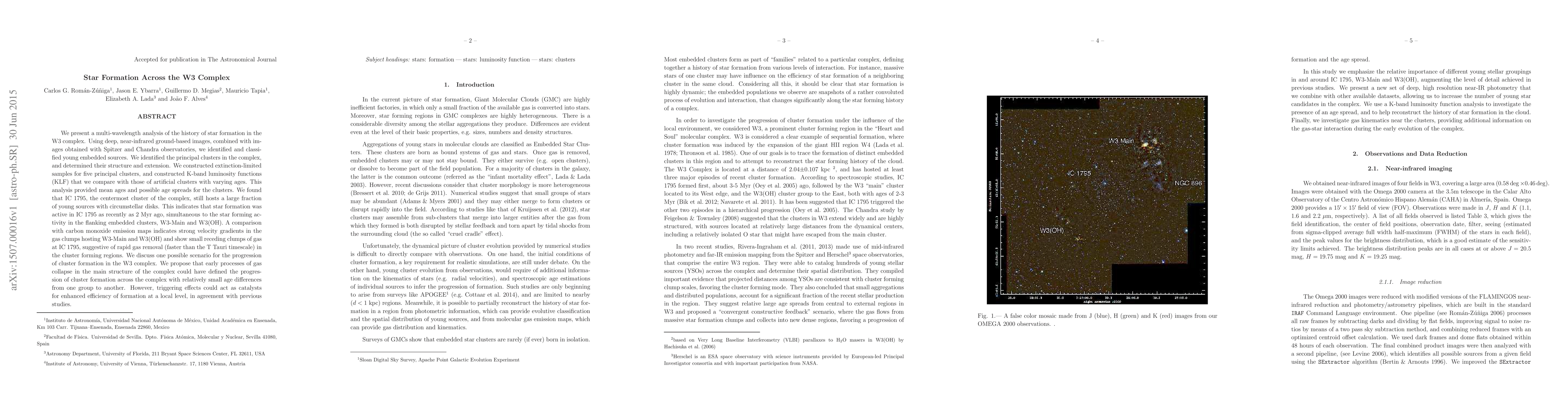 This paper uses multi-wavelength observations to analyze star formation history in the W3 complex, identifying clusters with K-band luminosity functions and finding that IC 1795 still hosts young sources, indicating active star formation as recently as 2 Myr ago. The study suggests that gas collapse and triggering effects may define the progression of cluster formation across the complex.