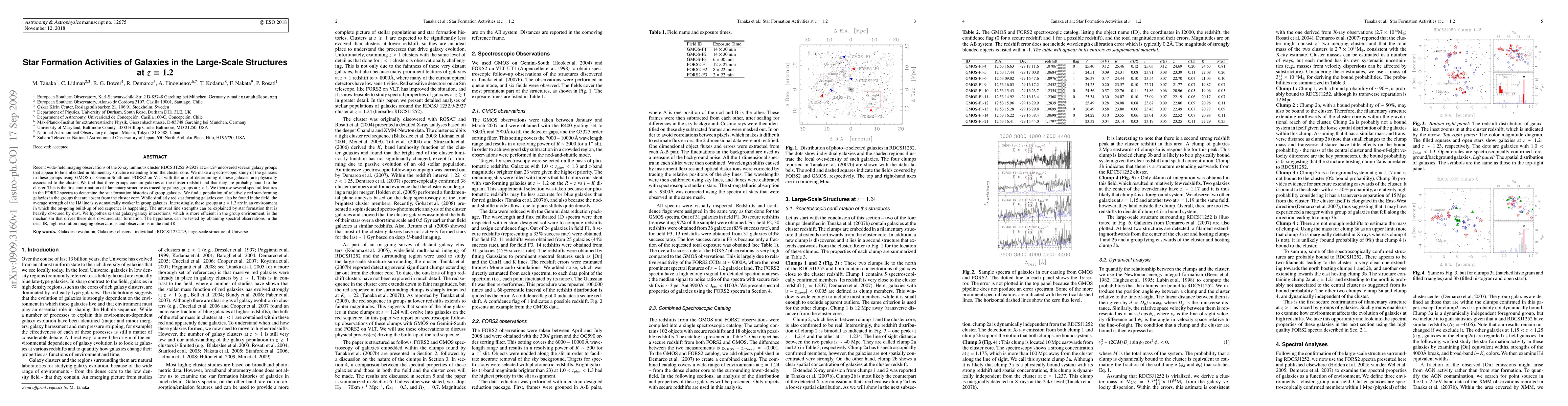 This study investigates galaxy groups embedded in filamentary structures within the X-ray luminous cluster RDCSJ1252.9-2927 at z=1.24, confirming their physical association and star formation activities. The research reveals a population of red star-forming galaxies in these groups, with weaker hd line strengths compared to the cluster core, suggesting dust-obscured star formation driven by galaxy-galaxy interactions.