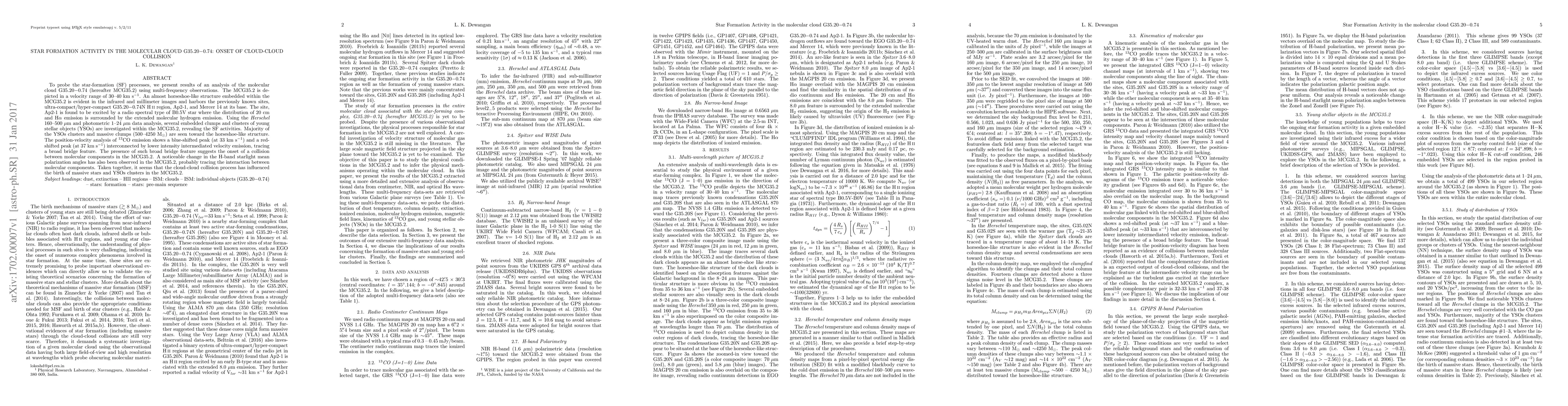To probe the star-formation (SF) processes, we present results of an analysis of the molecular cloud G35.20$-$0.74 (hereafter MCG35.2) using multi-frequency observations. The MCG35.2 is depicted in a velocity range of 30-40 km s$^{-1}$. An almost horseshoe-like structure embedded within the MCG35.2 is evident in the infrared and millimeter images and harbors the previously known sites, ultra-compact/hyper-compact G35.20$-$0.74N H\,{\sc ii} region, Ap2-1, and Mercer 14 at its base. The site, Ap2-1 is found to be excited by a radio spectral type of B0.5V star where the distribution of 20 cm and H$\alpha$ emission is surrounded by the extended molecular hydrogen emission. Using the {\it Herschel} 160-500 $\mu$m and photometric 1-24 $\mu$m data analysis, several embedded clumps and clusters of young stellar objects (YSOs) are investigated within the MCG35.2, revealing the SF activities. Majority of the YSOs clusters and massive clumps (500-4250 M$_{\odot}$) are seen toward the horseshoe-like structure. The position-velocity analysis of $^{13}$CO emission shows a blue-shifted peak (at 33 km s$^{-1}$) and a red-shifted peak (at 37 km s$^{-1}$) interconnected by lower intensity intermediated velocity emission, tracing a broad bridge feature. The presence of such broad bridge feature suggests the onset of a collision between molecular components in the MCG35.2. A noticeable change in the H-band starlight mean polarization angles has also been observed in the MCG35.2, probably tracing the interaction between molecular components. Taken together, it seems that the cloud-cloud collision process has influenced the birth of massive stars and YSOs clusters in the MCG35.2.