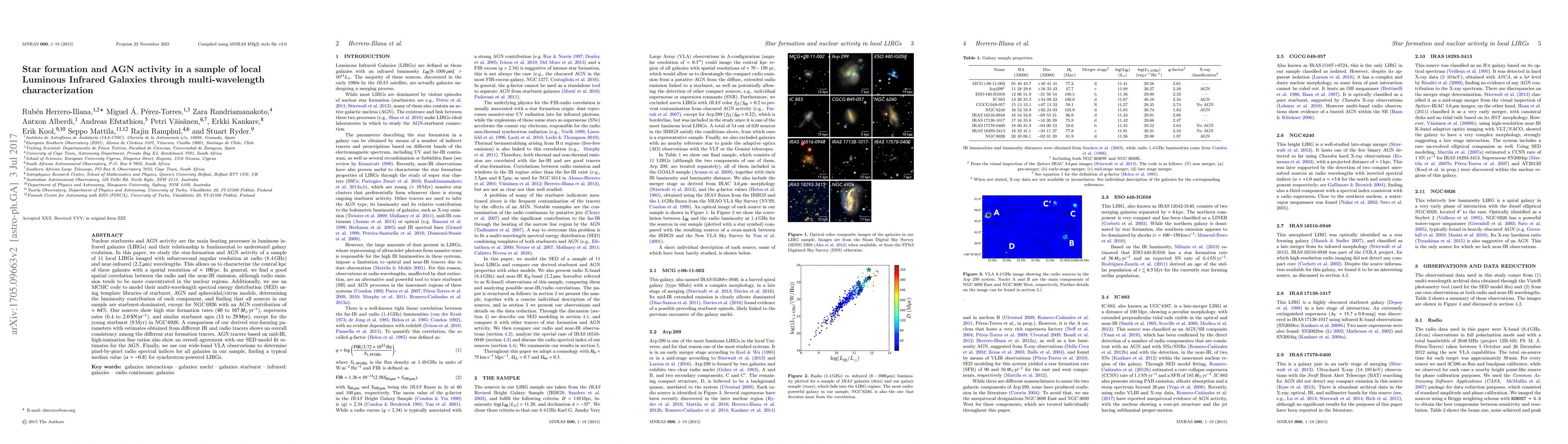 Nuclear starbursts and AGN activity are the main heating processes in luminous infrared galaxies (LIRGs) and their relationship is fundamental to understand galaxy evolution. In this paper, we study the star-formation and AGN activity of a sample of 11 local LIRGs imaged with subarcsecond angular resolution at radio (8.4GHz) and near-infrared ($2.2\mu$m) wavelengths. This allows us to characterize the central kpc of these galaxies with a spatial resolution of $\simeq100$pc. In general, we find a good spatial correlation between the radio and the near-IR emission, although radio emission tends to be more concentrated in the nuclear regions. Additionally, we use an MCMC code to model their multi-wavelength spectral energy distribution (SED) using template libraries of starburst, AGN and spheroidal/cirrus models, determining the luminosity contribution of each component, and finding that all sources in our sample are starburst-dominated, except for NGC6926 with an AGN contribution of $\simeq64$\%. Our sources show high star formation rates ($40$ to $167M_\odot\mathrm{yr}^{-1}$), supernova rates (0.4 to $2.0\mathrm{SN}\mathrm{yr}^{-1}$), and similar starburst ages (13 to $29\mathrm{Myr}$), except for the young starburst (9Myr) in NGC6926. A comparison of our derived star-forming parameters with estimates obtained from different IR and radio tracers shows an overall consistency among the different star formation tracers. AGN tracers based on mid-IR, high-ionization line ratios also show an overall agreement with our SED model fit estimates for the AGN. Finally, we use our wide-band VLA observations to determine pixel-by-pixel radio spectral indices for all galaxies in our sample, finding a typical median value ($\alpha\simeq-0.8$) for synchrotron-powered LIRGs.