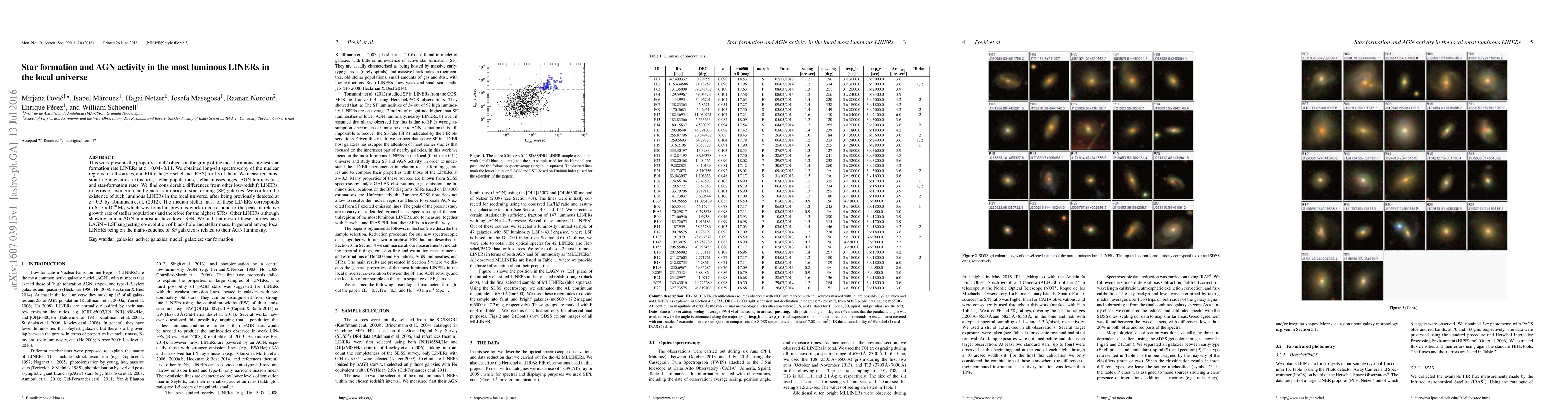 This work presents the properties of 42 objects in the group of the most luminous, highest star formation rate LINERs at z = 0.04 - 0.11. We obtained long-slit spectroscopy of the nuclear regions for all sources, and FIR data (Herschel and IRAS) for 13 of them. We measured emission line intensities, extinction, stellar populations, stellar masses, ages, AGN luminosities, and star-formation rates. We find considerable differences from other low-redshift LINERs, in terms of extinction, and general similarity to star forming (SF) galaxies. We confirm the existence of such luminous LINERs in the local universe, after being previously detected at z ~ 0.3 by Tommasin et al. (2012). The median stellar mass of these LINERs corresponds to 6 - 7 $\times$ 10$^{10}$M$_{\odot}$ which was found in previous work to correspond to the peak of relative growth rate of stellar populations and therefore for the highest SFRs. Other LINERs although showing similar AGN luminosities have lower SFR. We find that most of these sources have LAGN ~ LSF suggesting co-evolution of black hole and stellar mass. In general among local LINERs being on the main-sequence of SF galaxies is related to their AGN luminosity.