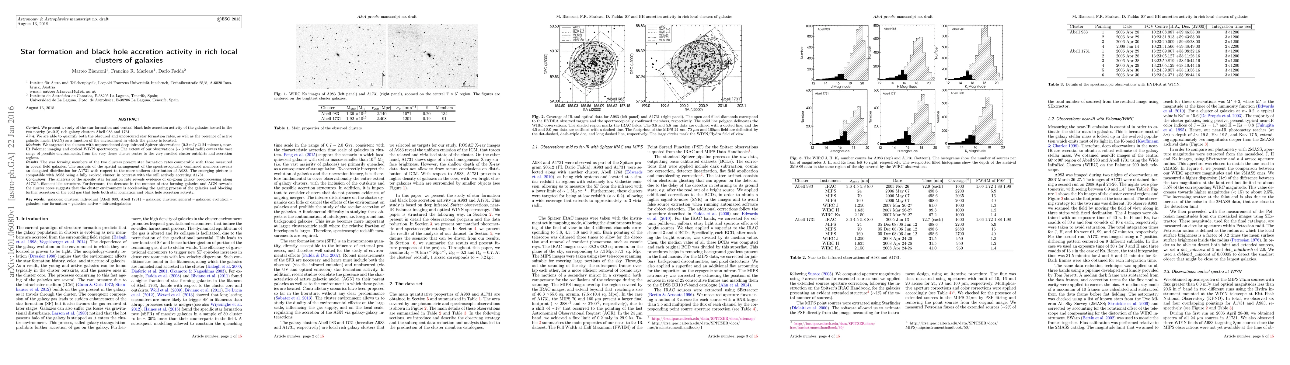 This study investigates star formation and black hole accretion in galaxies within the rich local clusters Abell 983 and 1731 using deep infrared observations and spectroscopy. Results show comparable star formation rates to field galaxies, with the clusters exhibiting distinct environmental effects on galaxy evolution and accretion processes.