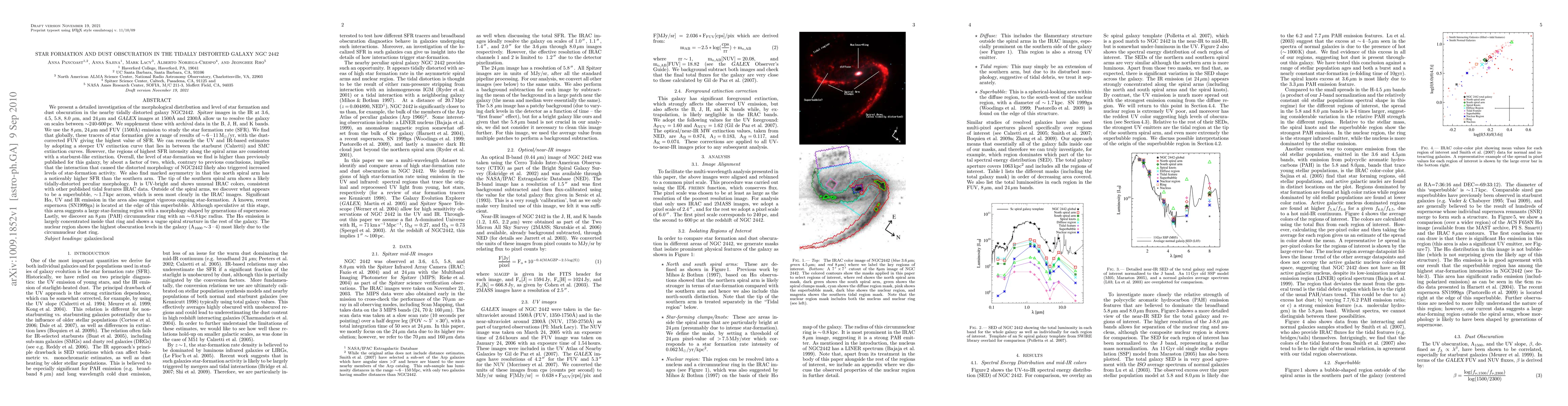 Abridged: We present a detailed investigation of the morphological distribution and level of star formation and dust obscuration in the nearby tidally distorted galaxy NGC2442. Spitzer images in the IR at 3.6, 4.5, 5.8, 8.0um, and 24um and GALEX images at 1500\AA{} and 2300\AA{} allow us to resolve the galaxy on scales between 240-600pc. We supplement these with archival data in the B, J, H, and K bands. We use the 8um, 24um and FUV (1500\AA) emission to study the star formation rate (SFR). We find that globally, these tracers of star formation give a range of results of ~6-11\msun/yr, with the dust-corrected FUV giving the highest value of SFR. We can reconcile the UV and IR-based estimates by adopting a steeper UV extinction curve that lies in between the starburst (Calzetti) and SMC extinction curves. However, the regions of highest SFR intensity along the spiral arms are consistent with a starburst-like extinction. Overall, the level of star-formation we find is higher than previously published for this galaxy, by about a factor of two, which, contrary to previous conclusions, implies that the interaction that caused the distorted morphology of NGC2442 likely also triggered increased levels of star-formation activity. Outside of the spiral arms, we discover what appears to be a superbubble, ~1.7kpc across in the IRAC images. Significant H{\alpha}, UV and IR emission in the area also suggest vigorous ongoing star-formation. A known, recent supernova (SN1999ga) is located at the edge of this superbubble. Although speculative at this stage, this area suggests a large star-forming region with a morphology shaped by generations of supernovae. Lastly, we discover an 8um (PAH) circumnuclear ring with an ~0.8kpc radius. The H{\alpha} emission is largely concentrated inside that ring and shows a vague spiral structure in the rest of the galaxy.
