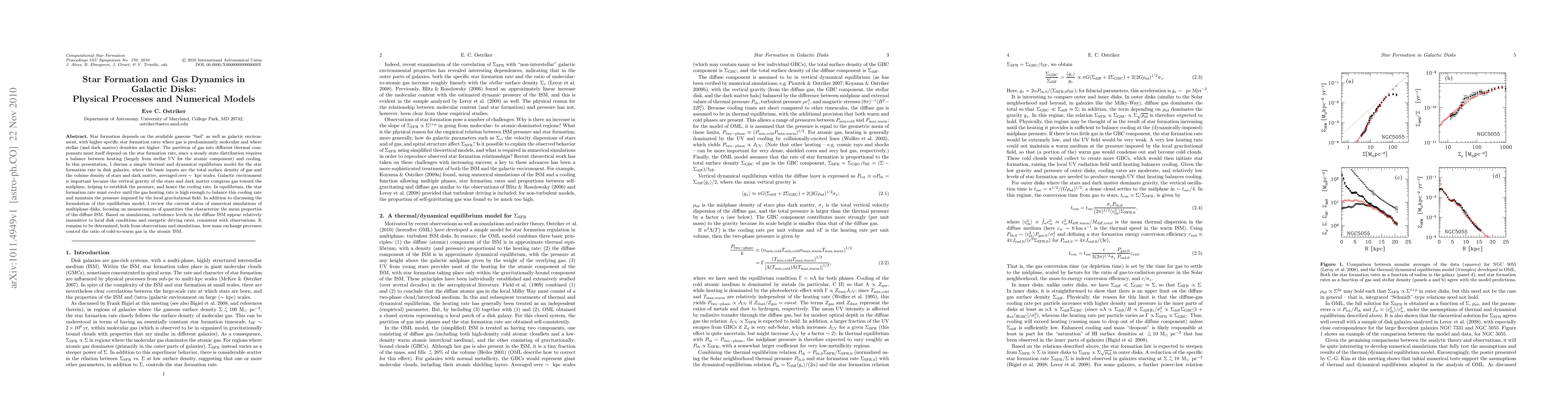 This paper presents a thermal and dynamical equilibrium model for star formation in disk galaxies, emphasizing the interplay between gas density, stellar density, and gravitational compression. It also reviews numerical simulations of multiphase disks, highlighting the relatively constant turbulence levels and the need for further study on mass exchange processes affecting the gas ratio in the ISM.