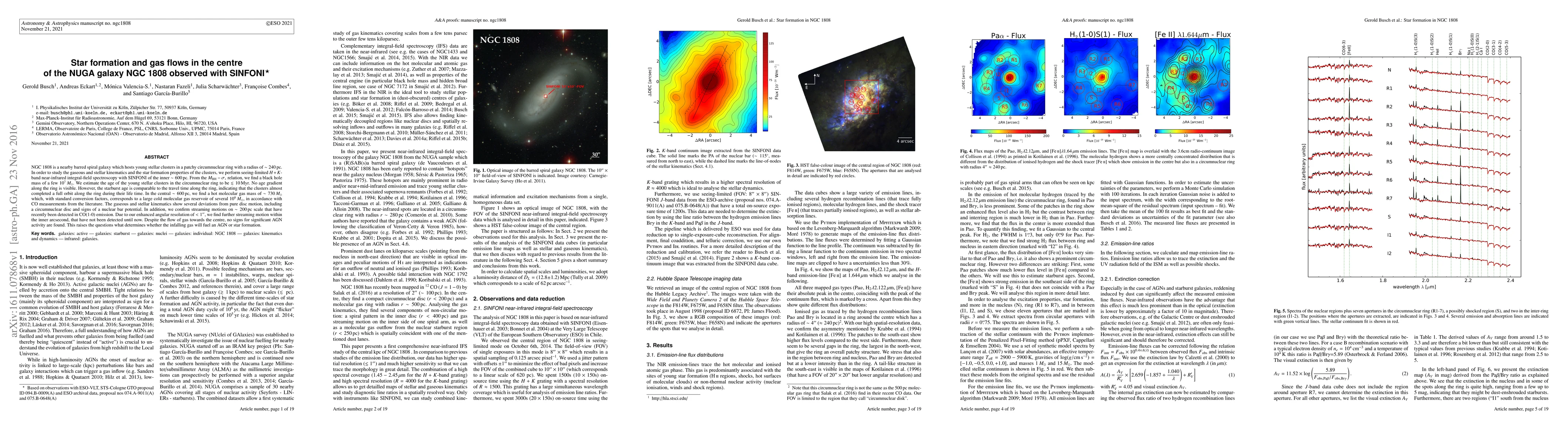 NGC 1808 is a nearby barred spiral galaxy which hosts young stellar clusters in a patchy circumnuclear ring with a radius of $\sim 240\,\mathrm{pc}$. In order to study the gaseous and stellar kinematics and the star formation properties of the clusters, we perform seeing-limited $H+K$-band near-infrared integral-field spectroscopy with SINFONI of the inner $\sim 600\,\mathrm{pc}$. From the $M_\mathrm{BH}-\sigma_*$ relation, we find a black hole mass of a few $10^7\,M_\odot$. We estimate the age of the young stellar clusters in the circumnuclear ring to be $\lesssim 10\,\mathrm{Myr}$. No age gradient along the ring is visible. However, the starburst age is comparable to the travel time along the ring, indicating that the clusters almost completed a full orbit along the ring during their life time. In the central $\sim 600\,\mathrm{pc}$, we find a hot molecular gas mass of $\sim 730\,M_\odot$ which, with standard conversion factors, corresponds to a large cold molecular gas reservoir of several $10^8\,M_\odot$, in accordance with CO measurements from the literature. The gaseous and stellar kinematics show several deviations from pure disc motion, including a circumnuclear disc and signs of a nuclear bar potential. In addition, we confirm streaming motions on $\sim 200\,\mathrm{pc}$ scale that have recently been detected in CO(1-0) emission. Due to our enhanced angular resolution of $<1\,\mathrm{arcsec}$, we find further streaming motion within the inner arcsecond, that have not been detected until now. Despite the flow of gas towards the centre, no signs for significant AGN activity are found. This raises the questions what determines whether the infalling gas will fuel an AGN or star formation.