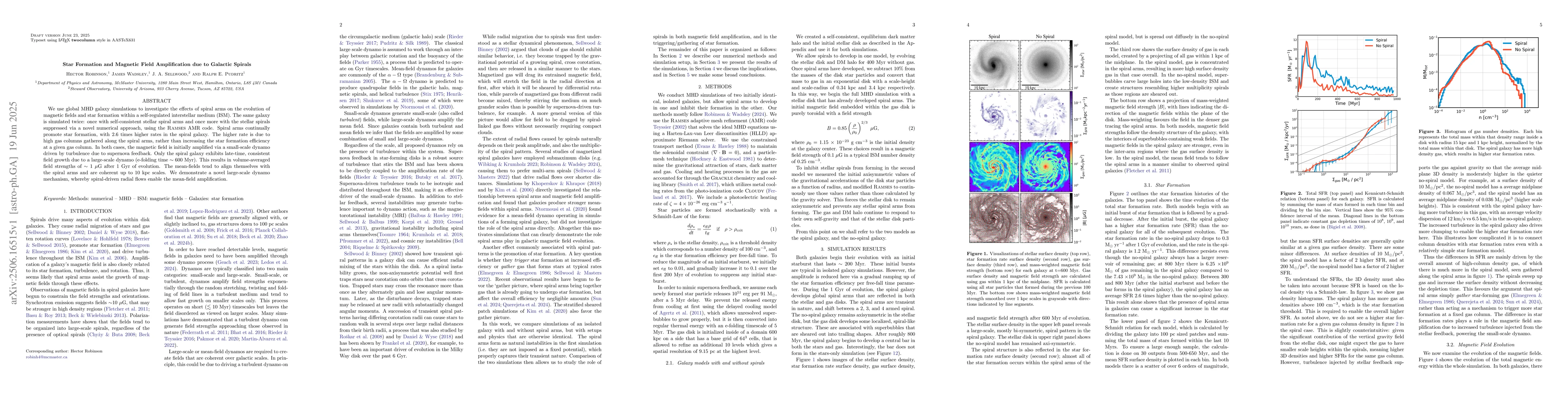 This study uses galaxy simulations to show that spiral arms boost star formation rates by 2.6 times due to compressed gas, not efficiency changes. Magnetic fields, initially amplified by turbulence, further grow via a large-scale dynamo in spiral galaxies, reaching 1 $mu$G after 1 Gyr, aligned with spiral arms over 10 kpc scales, revealing a novel dynamo mechanism.