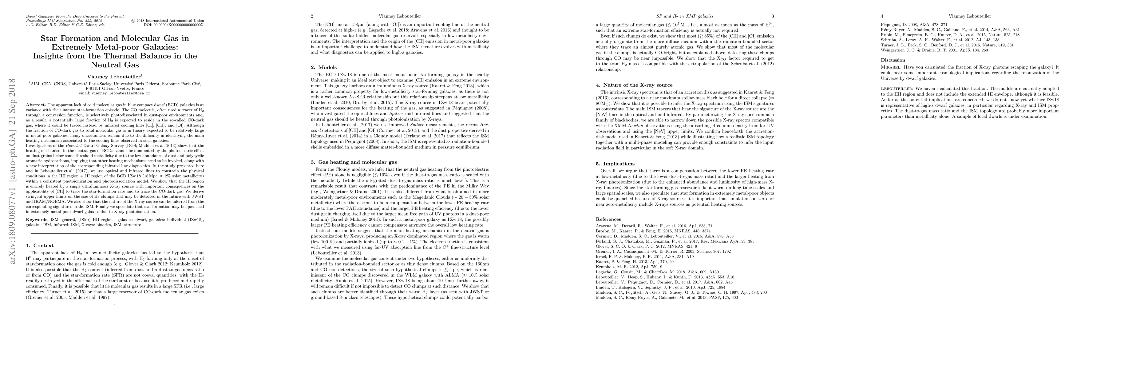 The apparent lack of cold molecular gas in blue compact dwarf (BCD) galaxies is at variance with their intense star-formation episode. The CO molecule, often used a tracer of H2 through a conversion function, is selectively photodissociated in dust-poor environments and, as a result, a potentially large fraction of H2 is expected to reside in the so-called CO-dark gas, where it could be traced instead by infrared cooling lines [CI], [CII], and [OI]. Although the fraction of CO-dark gas to total molecular gas is expected to be relatively large in metal-poor galaxies, many uncertainties remain due to the difficulty in identifying the main heating mechanism associated to the cooling lines observed in such galaxies. Investigations of the Herschel Dwarf Galaxy Survey show that the heating mechanism in the neutral gas of BCDs cannot be dominated by the photoelectric effect on dust grains below some threshold metallicity, implying that other heating mechanisms need to be invoked, along with a new interpretation of the corresponding infrared line diagnostics. In the study presented here and in Lebouteiller et al. 2017, we use optical and infrared lines to constrain the physical conditions in the HII region + HI region of the BCD IZw18 (18Mpc; 2% solar metallicity) within a consistent photoionization and photodissociation model. We show that the HI region is entirely heated by a single ultraluminous X-ray source with important consequences on the applicability of [CII] to trace the star-formation rate and to trace the CO-dark gas. We derive stringent upper limits on the size of H2 clumps that may be detected in the future with JWST and IRAM/NOEMA. We also show that the nature of the X-ray source can be inferred from the corresponding signatures in the ISM. Finally we speculate that star formation may be quenched in extremely metal-poor dwarf galaxies due to X-ray photoionization.