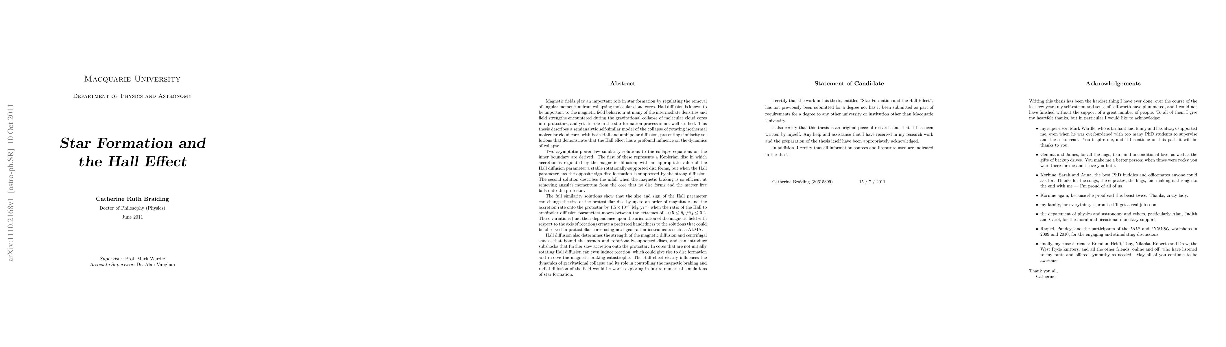Magnetic fields play an important role in star formation by regulating the removal of angular momentum from collapsing molecular cloud cores. Hall diffusion is known to be important to the magnetic field behaviour at many of the intermediate densities and field strengths encountered during the gravitational collapse of molecular cloud cores into protostars, and yet its role in the star formation process is not well-studied. This thesis describes a semianalytic self-similar model of the collapse of rotating isothermal molecular cloud cores with both Hall and ambipolar diffusion, presenting similarity solutions that demonstrate that the Hall effect has a profound influence on the dynamics of collapse. ... Hall diffusion also determines the strength of the magnetic diffusion and centrifugal shocks that bound the pseudo and rotationally-supported discs, and can introduce subshocks that further slow accretion onto the protostar. In cores that are not initially rotating Hall diffusion can even induce rotation, which could give rise to disc formation and resolve the magnetic braking catastrophe. The Hall effect clearly influences the dynamics of gravitational collapse and its role in controlling the magnetic braking and radial diffusion of the field would be worth exploring in future numerical simulations of star formation.