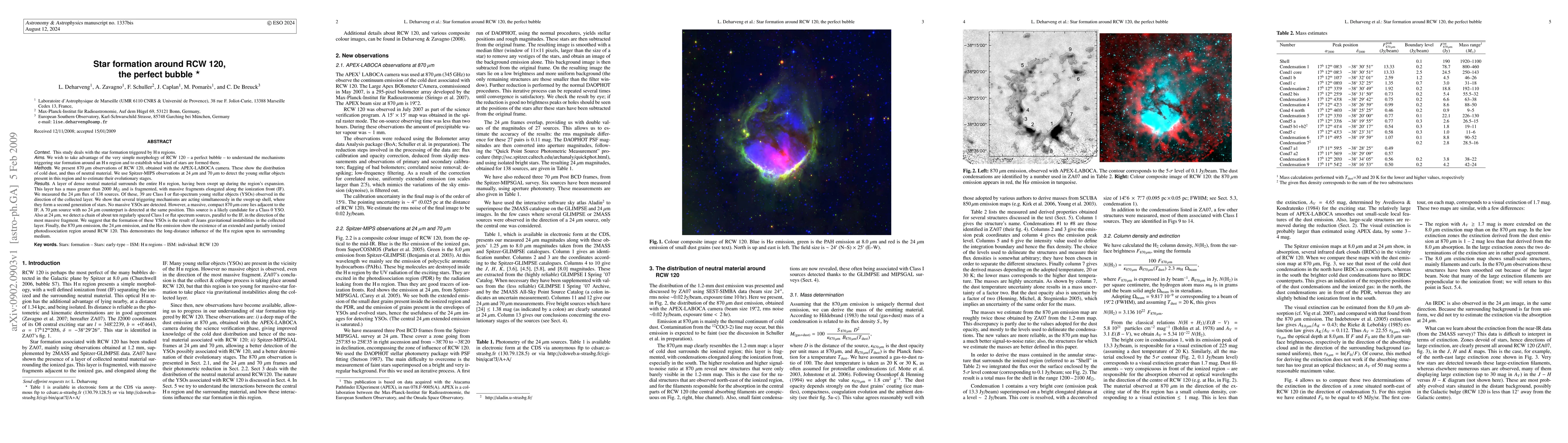 We take advantage of the very simple morphology of RCW 120 -- a perfect bubble -- to understand the mechanisms triggering star formation around an HII region and to establish what kind of stars are formed there. We present 870 microns observations of RCW 120, obtained with the APEX-LABOCA camera. These show the distribution of cold dust, and thus of neutral material. We use Spitzer-MIPS observations at 24 and 70 microns to detect the young stellar objects (YSOs) present in this region and to estimate their evolutionary stages. A layer of dense neutral material surrounds the HII region, having been swept up during the region's expansion. This layer has a mass greater than 2000 solar masses and is fragmented, with massive fragments elongated along the ionization front (IF). We measured the 24 microns flux of 138 sources. Of these, 39 are Class I or flat-spectrum YSOs observed in the direction of the collected layer. We show that several triggering mechanisms are acting simultaneously in the swept-up shell, where they form a second generation of stars. No massive YSOs are detected. However, a massive, compact 870 microns core lies adjacent to the IF. A 70 microns source with no 24 microns counterpart is detected at the same position. This source is a likely candidate for a Class 0 YSO. Also at 24 microns, we detect a chain of about ten regularly spaced Class I or flat spectrum sources, parallel to the IF, in the direction of the most massive fragment. We suggest that the formation of these YSOs is the result of Jeans gravitational instabilities in the collected layer. Finally, the 870 microns emission, the 24 microns emission, and the Halpha emission show the existence of an extended and partially ionized photodissociation region around RCW 120.