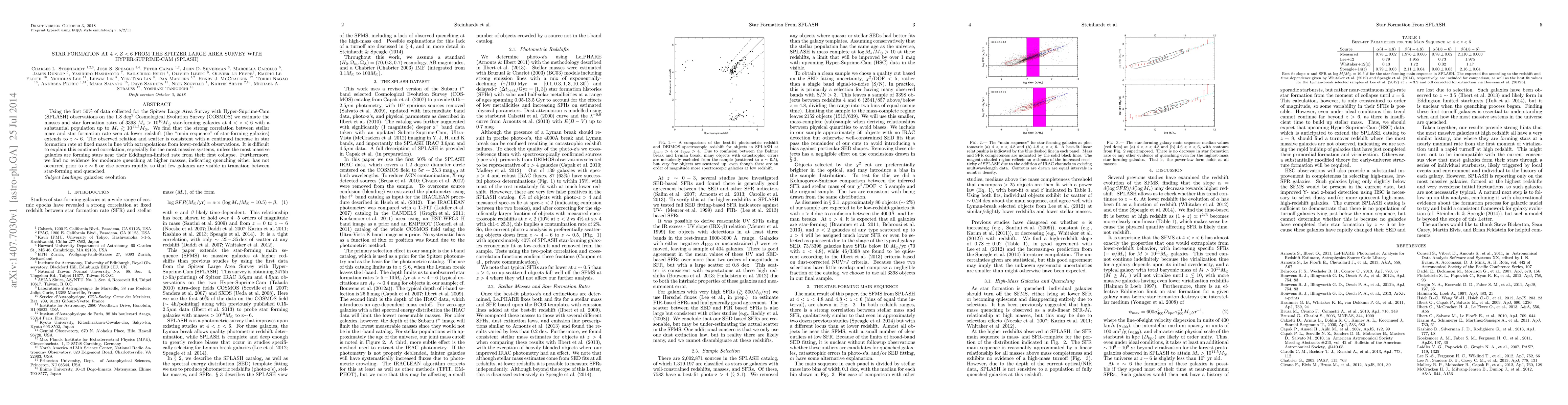 Using the first 50% of data collected for the Spitzer Large Area Survey with Hyper-Suprime-Cam (SPLASH) observations on the 1.8 deg$^2$ Cosmological Evolution Survey (COSMOS) we estimate the masses and star formation rates of 3398 $M_*>10^{10}M_\odot $ star-forming galaxies at $4 < z < 6$ with a substantial population up to $M_* \gtrsim 10^{11.5} M_\odot$. We find that the strong correlation between stellar mass and star formation rate seen at lower redshift (the "main sequence" of star-forming galaxies) extends to $z\sim6$. The observed relation and scatter is consistent with a continued increase in star formation rate at fixed mass in line with extrapolations from lower-redshift observations. It is difficult to explain this continued correlation, especially for the most massive systems, unless the most massive galaxies are forming stars near their Eddington-limited rate from their first collapse. Furthermore, we find no evidence for moderate quenching at higher masses, indicating quenching either has not occurred prior to $z \sim 6$ or else occurs rapidly, so that few galaxies are visible in transition between star-forming and quenched.