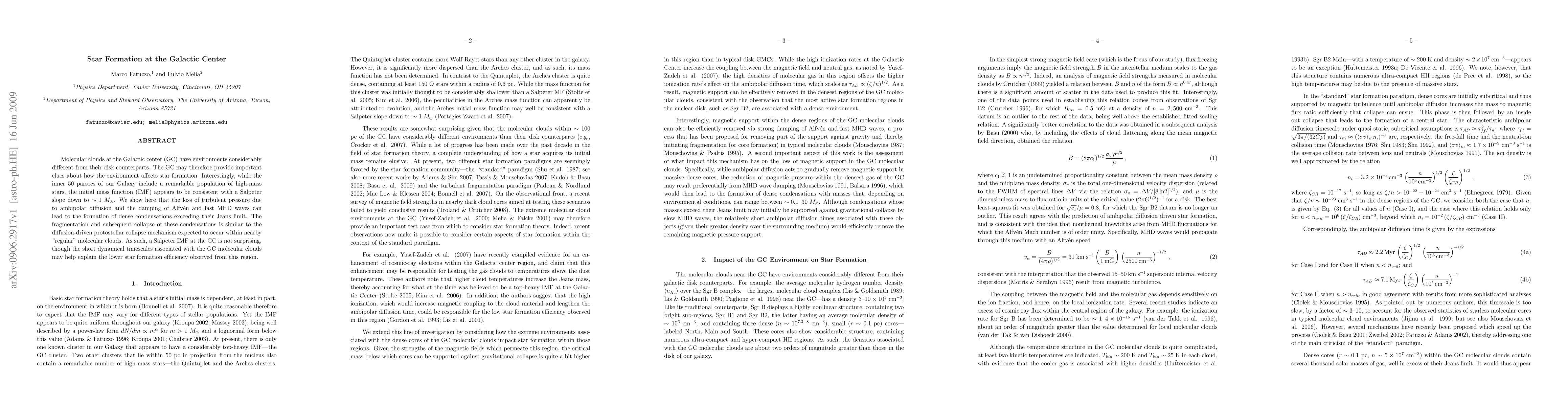 This paper investigates star formation in the Galactic Center's molecular clouds, noting that despite unique environmental conditions, the initial mass function resembles a Salpeter slope. The study suggests that the loss of turbulent pressure and damping of Alfven waves facilitate the formation of dense condensations, leading to fragmentation and protostellar collapse similar to processes in regular molecular clouds.